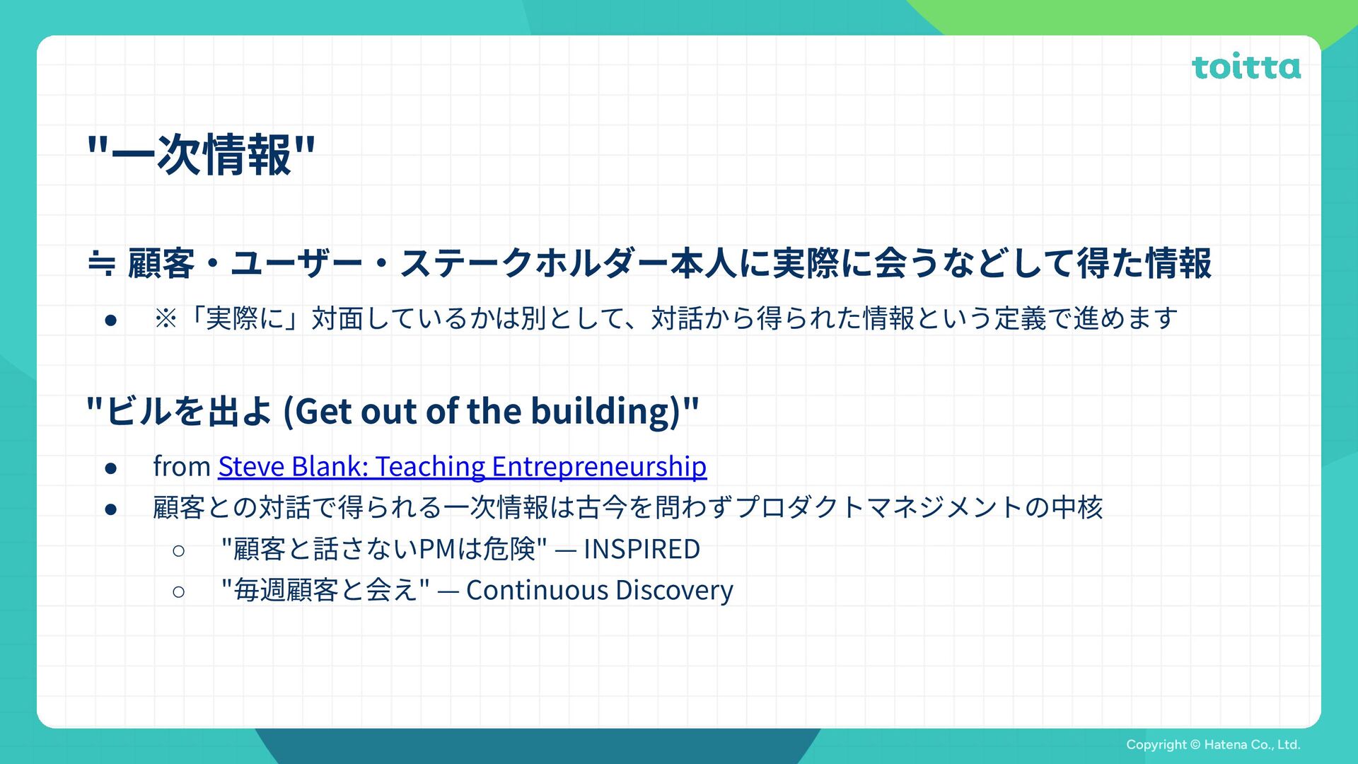 (Get out of the building)" • from Steve Blank: Teaching Entrepreneurship • 顧客との対話で得られる⼀次情報は古今を問わずプロダクトマネジメントの中核 ◦ "顧客と話さないPMは危険" — INSPIRED ◦ "毎週顧客と会え" — Continuous Discovery "⼀次情報"