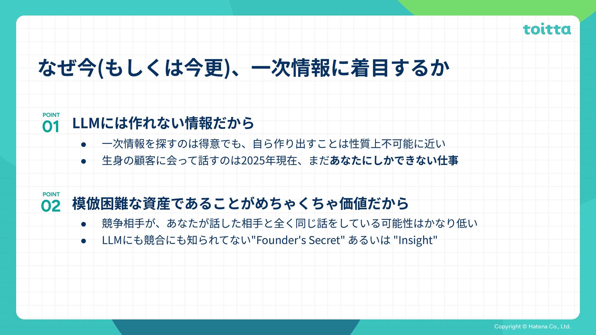 • ⼀次情報を探すのは得意でも、⾃ら作り出すことは性質上不可能に近い • ⽣⾝の顧客に会って話すのは2025年現在、まだあなたにしかできない仕事 LLMには作れない情報だから 模倣困難な資産であることがめちゃくちゃ価値だから • 競争相⼿が、あなたが話した相⼿と全く同じ話をしている可能性はかなり低い • LLMにも競合にも知られてない"Founder's Secret" あるいは "Insight"