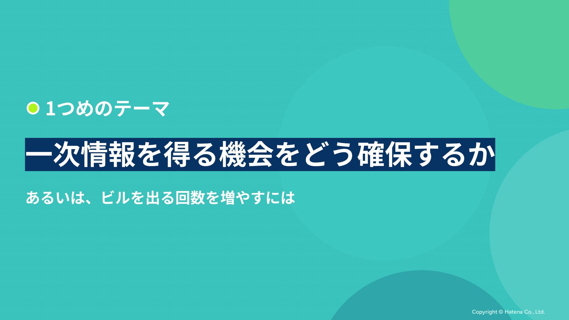 Copyright © Hatena Co., Ltd. ⼀次情報を得る機会をどう確保するか あるいは、ビルを出る回数を増やすには 1つめのテーマ