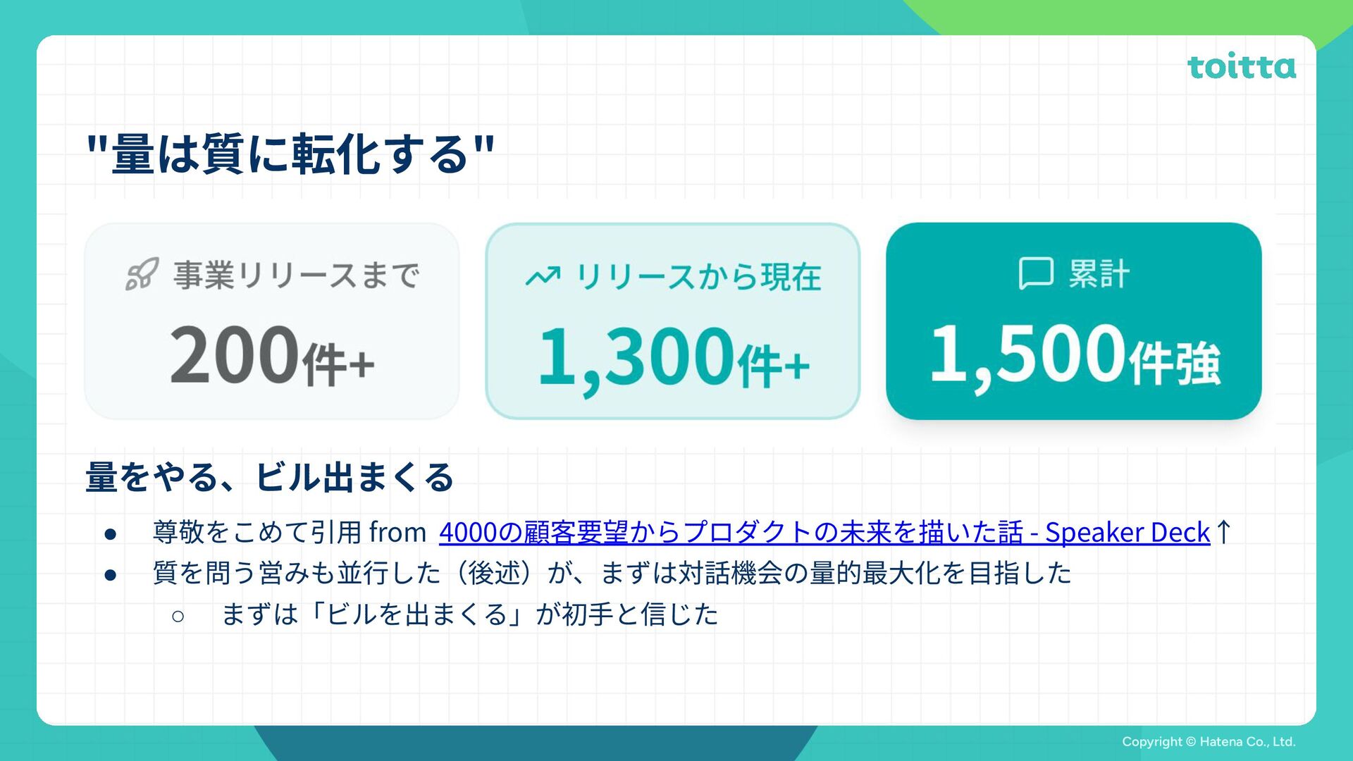 ◦ 累計 1,500件強の対話 量をやる、ビル出まくる • 尊敬をこめて引⽤ from 4000の顧客要望からプロダクトの未来を描いた話 - Speaker Deck↑ • 質を問う営みも並⾏した(後述)が、まずは対話機会の量的最⼤化を⽬指した ◦ まずは「ビルを出まくる」が初⼿と信じた "量は質に転化する"
