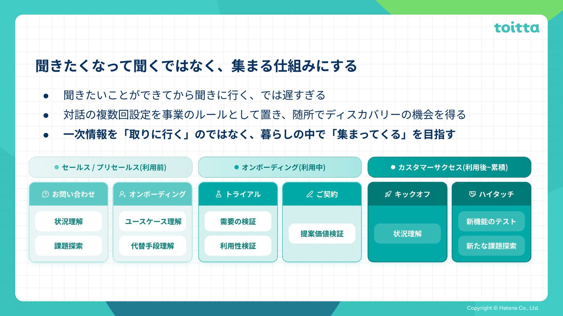 Copyright © Hatena Co., Ltd. • 聞きたいことができてから聞きに⾏く、では遅すぎる • 対話の複数回設定を事業のルールとして置き、随所でディスカバリーの機会を得る •