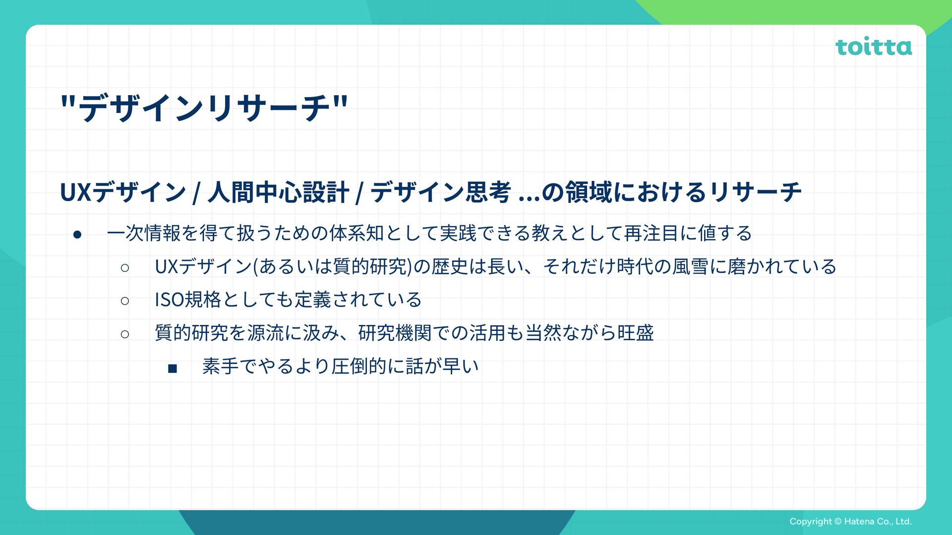 Copyright © Hatena Co., Ltd. • ⼀次情報を得て扱うための体系知として実践できる教えとして再注⽬に値する ◦ UXデザイン(あるいは質的研究)の歴史は⻑い、それだけ時代の⾵雪に磨かれている ◦