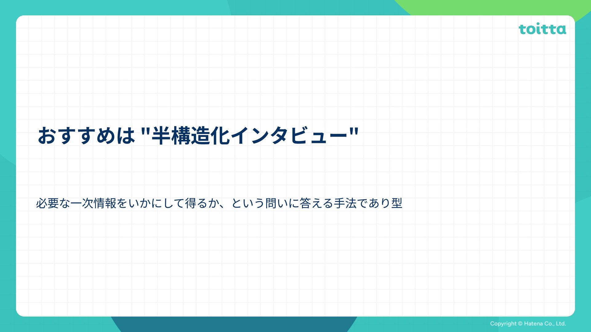 Copyright © Hatena Co., Ltd. 必要な⼀次情報をいかにして得るか、という問いに答える⼿法であり型 おすすめは "半構造化インタビュー"