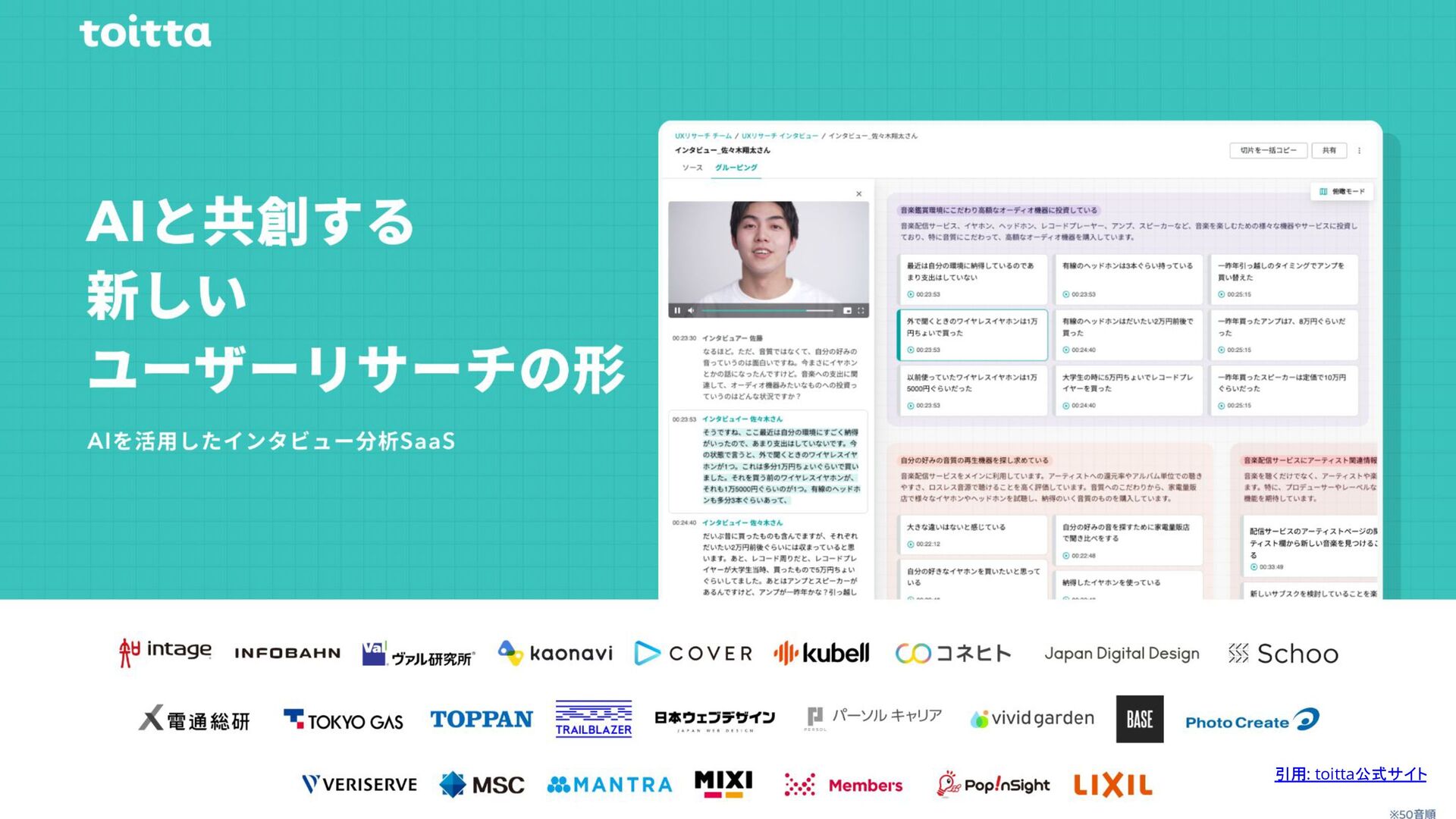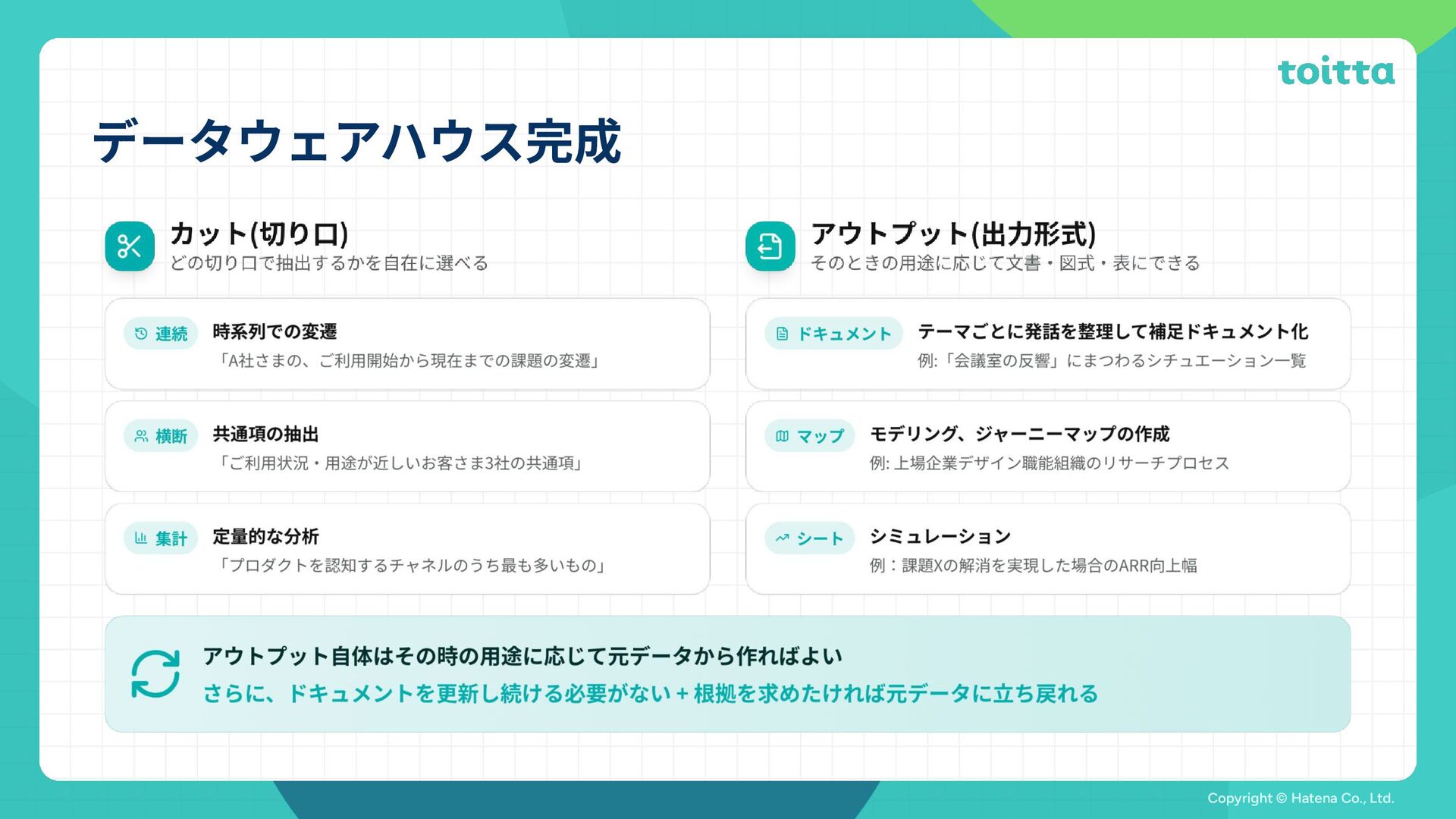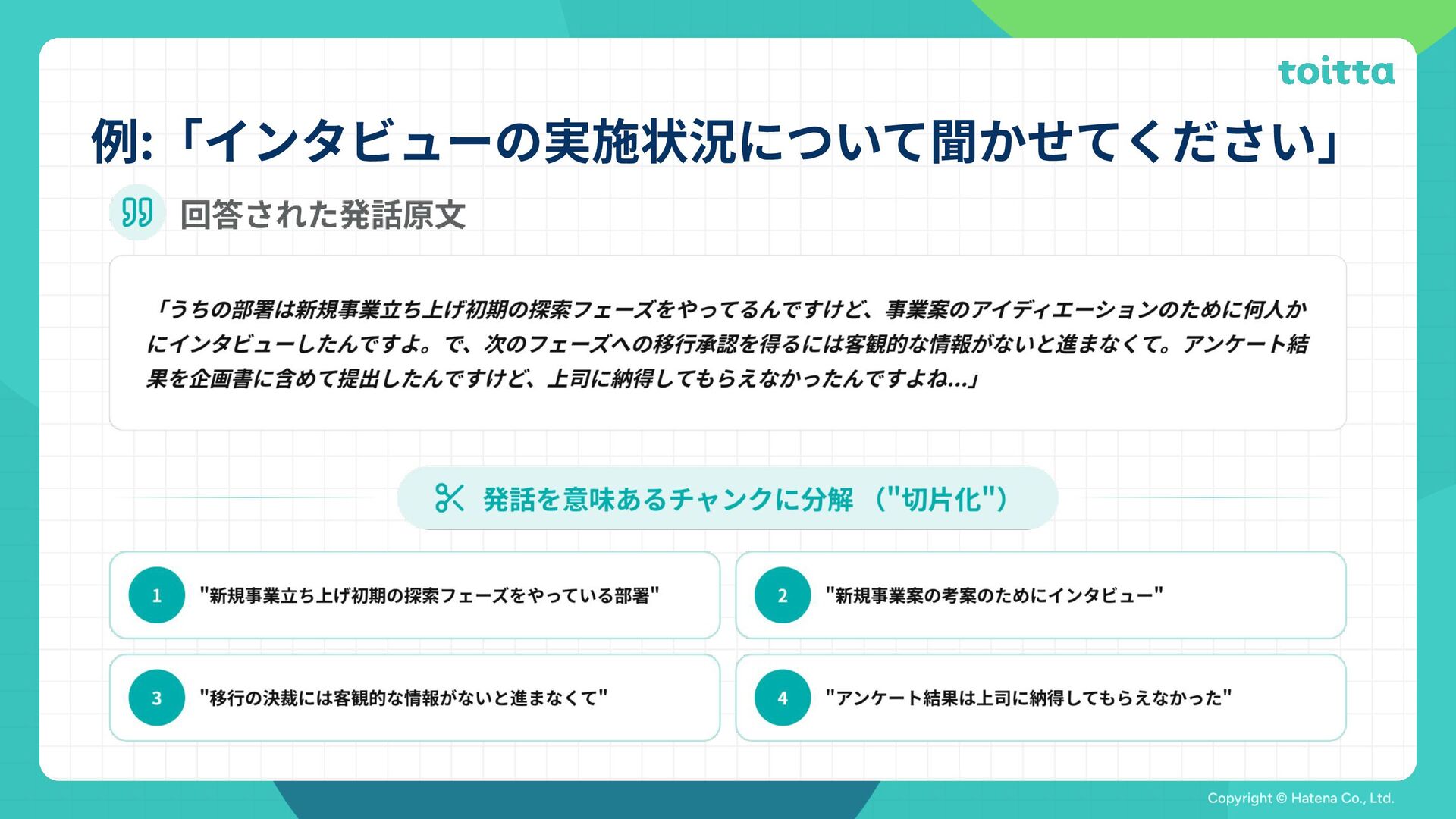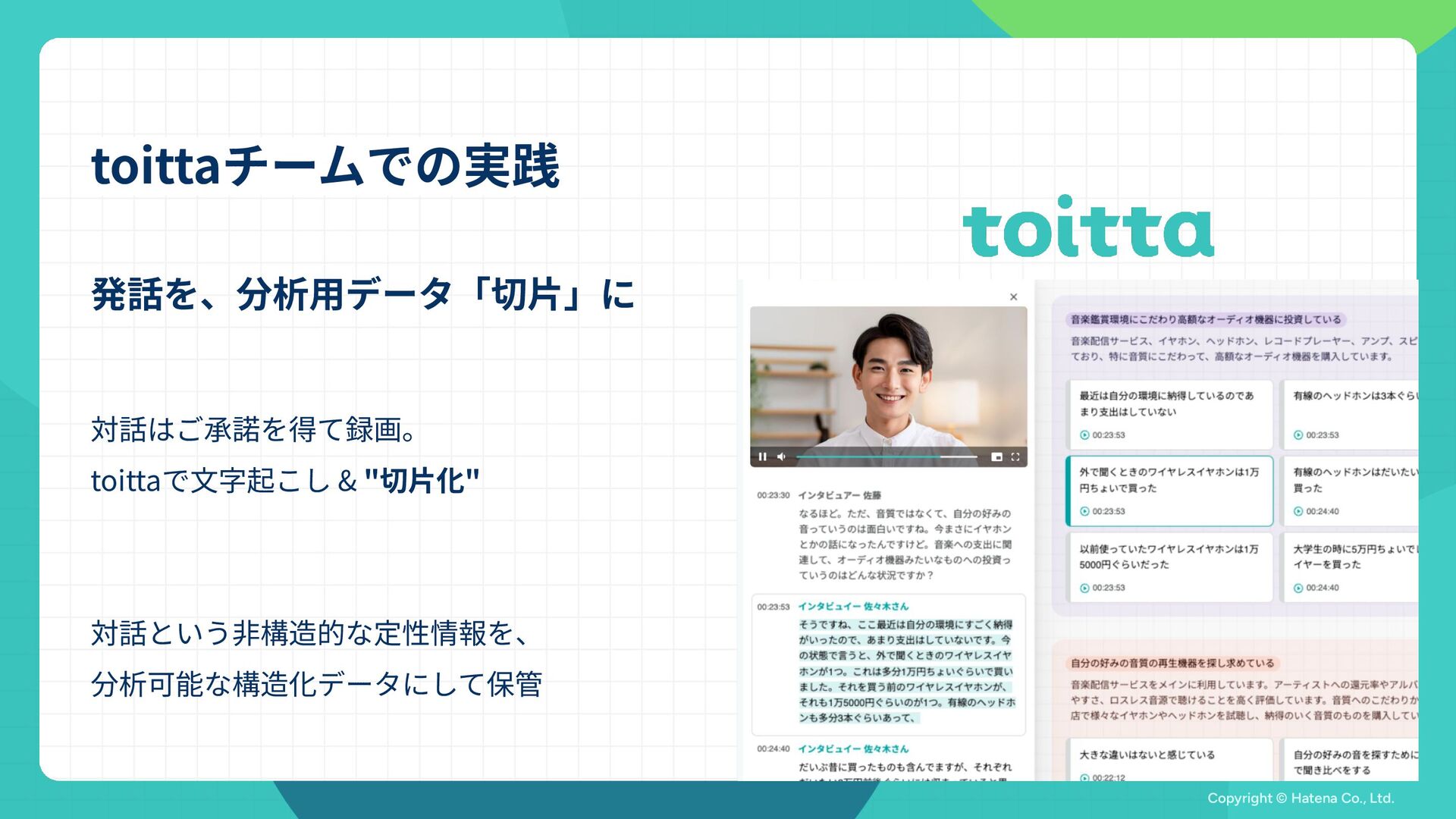 Copyright © Hatena Co., Ltd. 対話はご承諾を得て録画。 toittaで⽂字起こし & "切⽚化" 対話という⾮構造的な定性情報を、