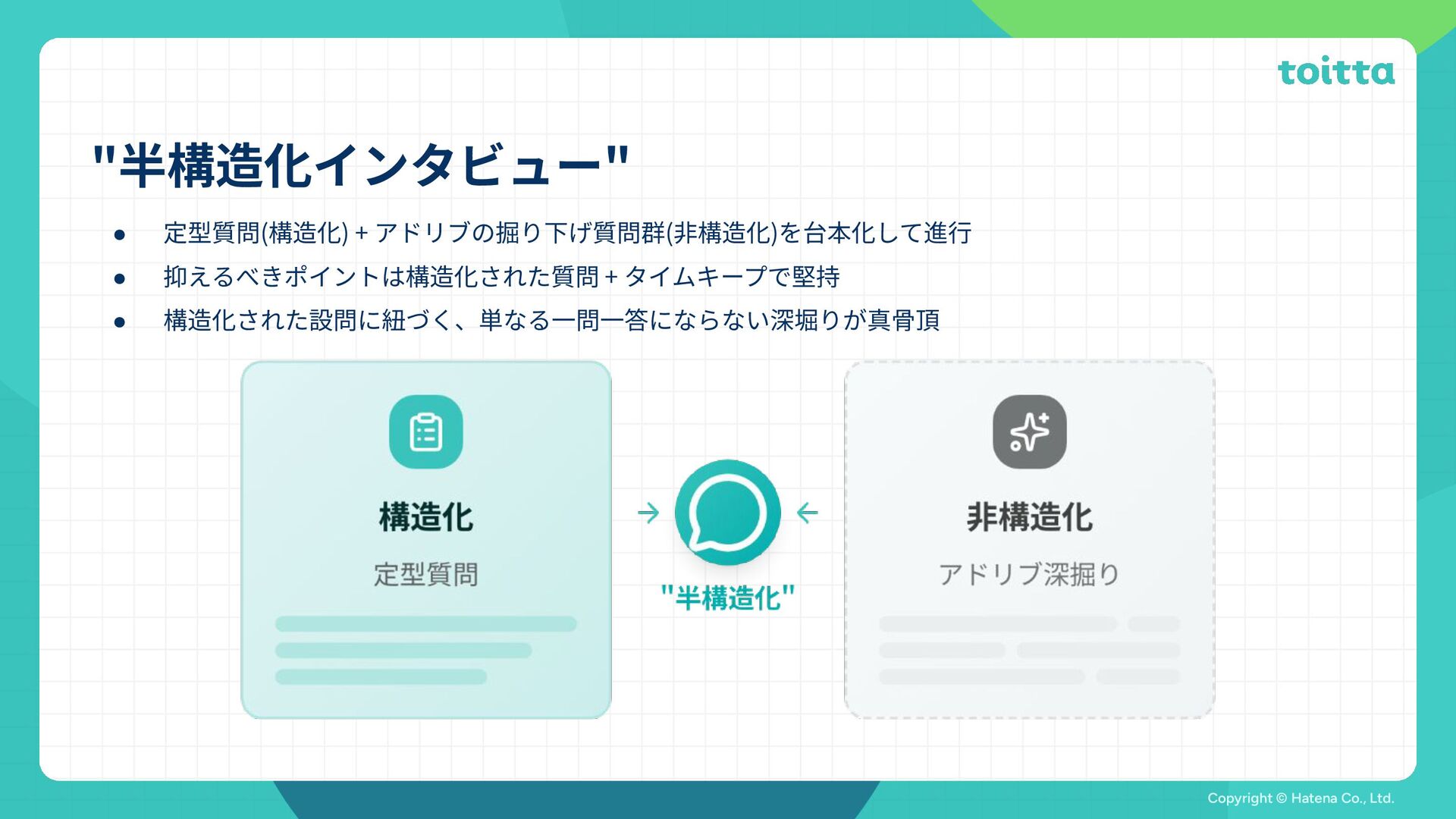 Copyright © Hatena Co., Ltd. • 定型質問(構造化) + アドリブの掘り下げ質問群(⾮構造化)を台本化して進⾏ •
