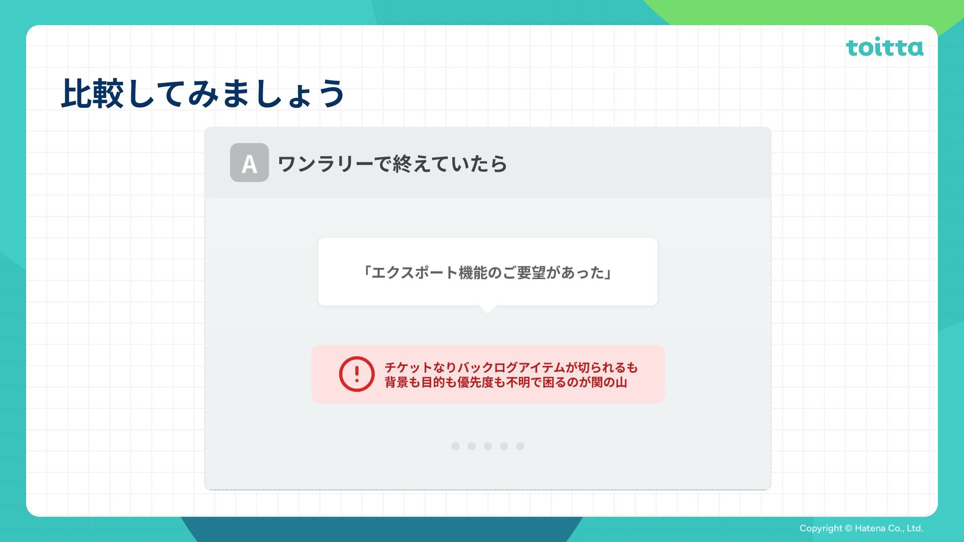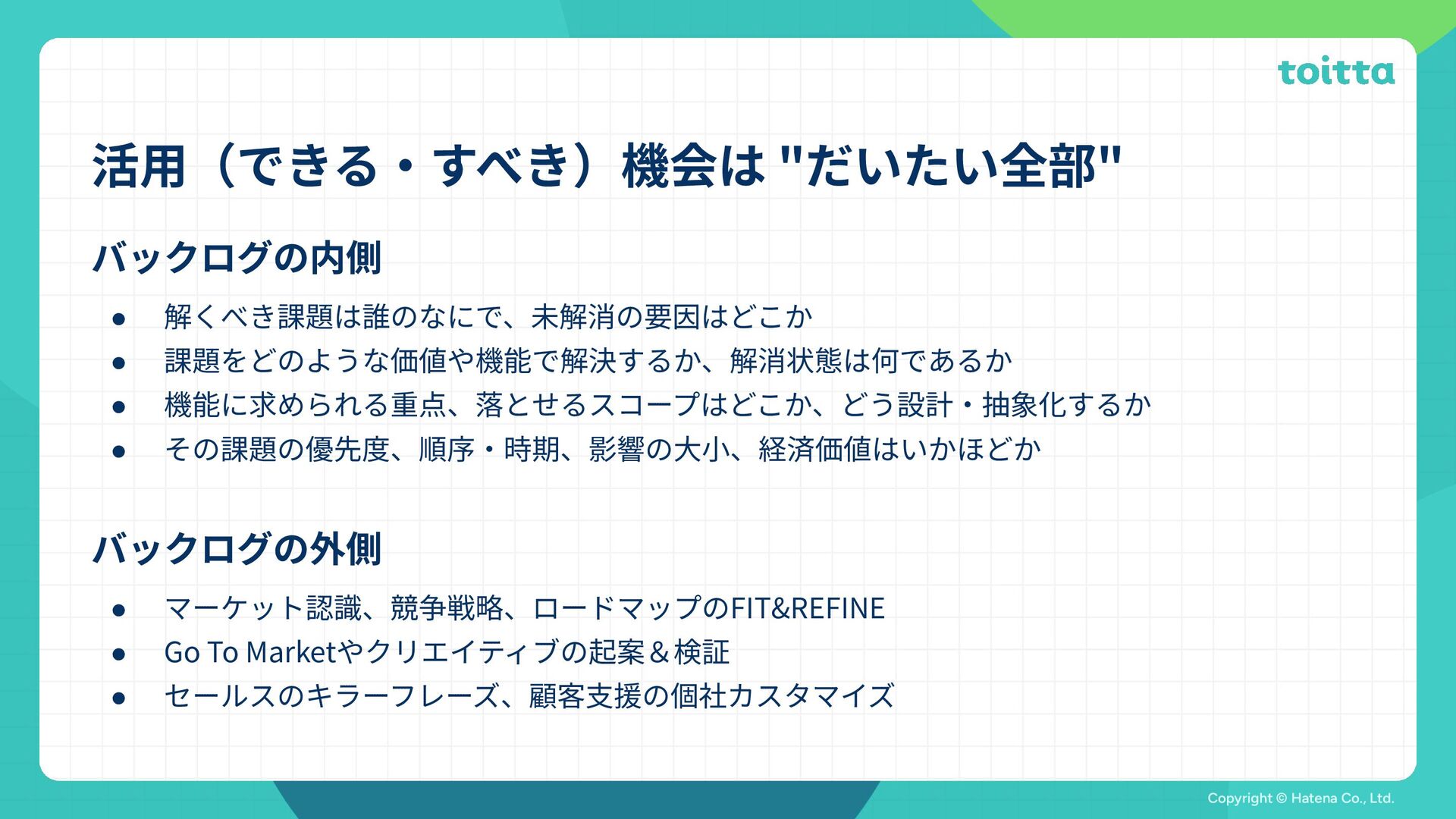Copyright © Hatena Co., Ltd. 活⽤(できる‧すべき)機会は "だいたい全部" バックログの内側 • 解くべき課題は誰のなにで、未解消の要因はどこか