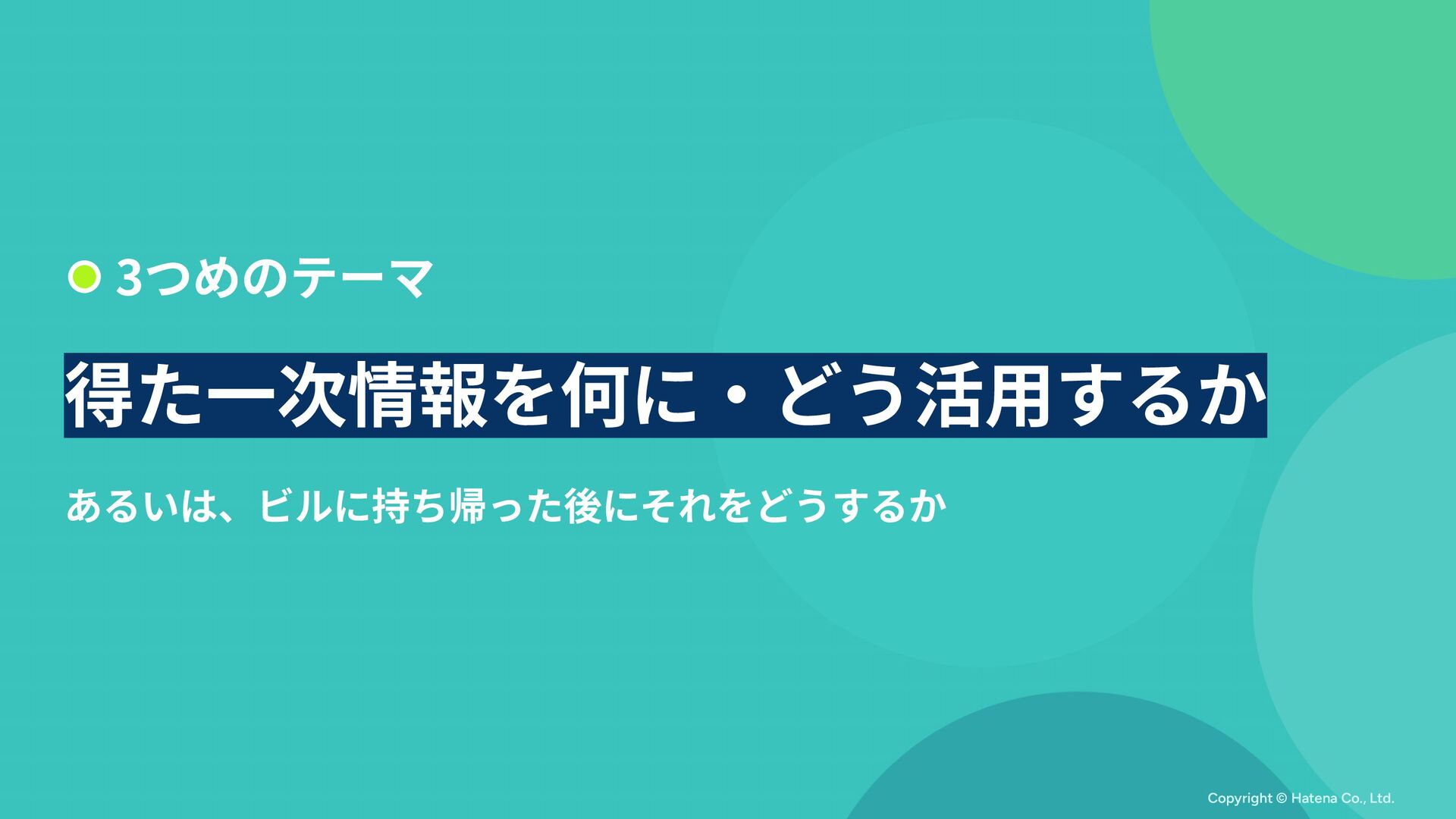 Copyright © Hatena Co., Ltd. 得た⼀次情報を何に‧どう活⽤するか あるいは、ビルに持ち帰った後にそれをどうするか 3つめのテーマ