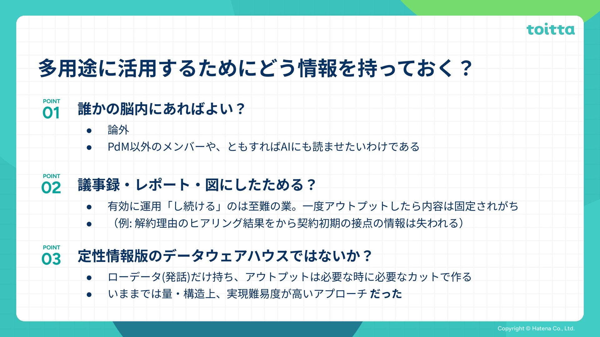 Ltd. • 論外 • PdM以外のメンバーや、ともすればAIにも読ませたいわけである 多⽤途に活⽤するためにどう情報を持っておく? 定性情報版のデータウェアハウスではないか? 誰かの脳内にあればよい? 議事録‧レポート‧図にしたためる? • 有効に運⽤「し続ける」のは⾄難の業。⼀度アウトプットしたら内容は固定されがち • (例: 解約理由のヒアリング結果をから契約初期の接点の情報は失われる) • ローデータ(発話)だけ持ち、アウトプットは必要な時に必要なカットで作る • いままでは量‧構造上、実現難易度が⾼いアプローチ だった