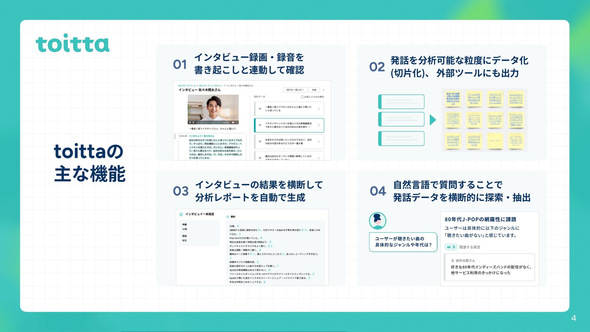 toittaの 主な機能 インタビュー録画‧録⾳を 書き起こしと連動して確認 4 ⾃然⾔語で質問することで 発話データを横断的に探索‧抽出 インタビューの結果を横断して 分析レポートを⾃動で⽣成