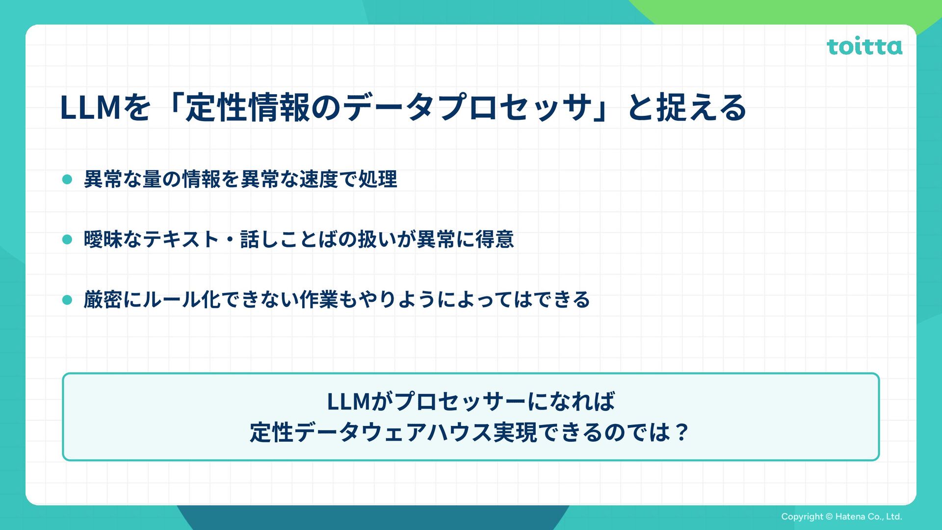 Copyright © Hatena Co., Ltd. 異常な量の情報を異常な速度で処理 LLMを「定性情報のデータプロセッサ」と捉える LLMがプロセッサーになれば 定性データウェアハウス実現できるのでは? 曖昧なテキスト‧話しことばの扱いが異常に得意