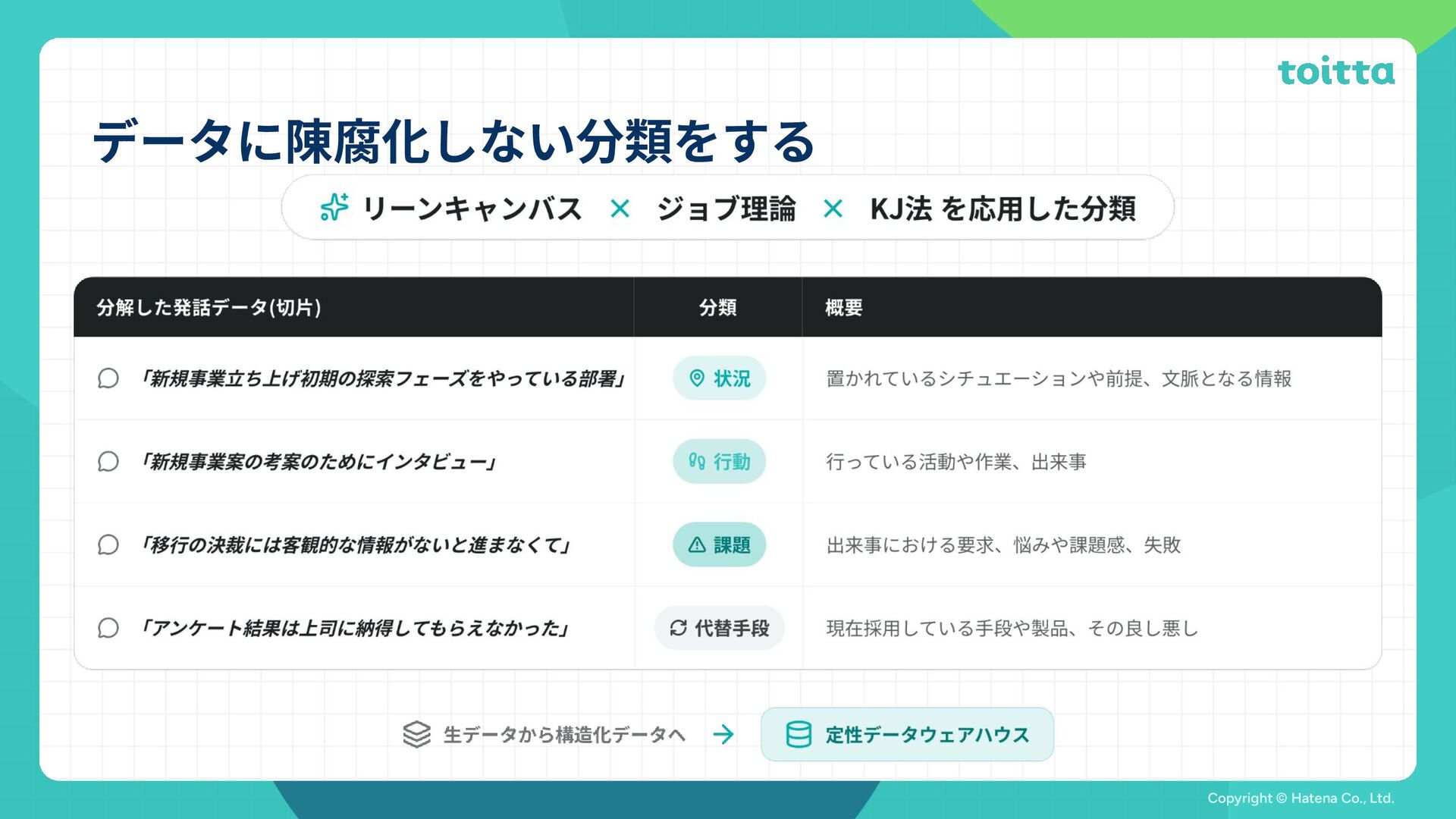 分析可能な構造化データにして保管 発話を、分析⽤データ「切⽚」に toittaチームでの実践