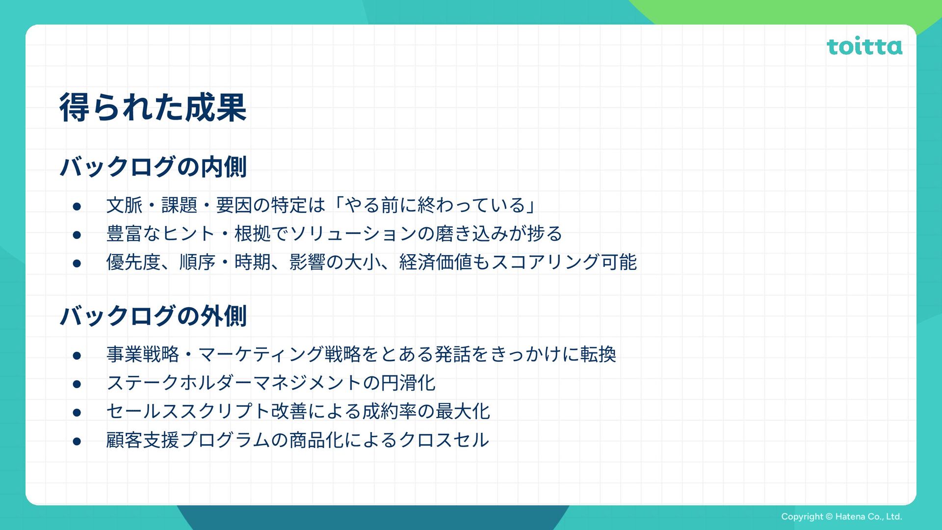 Copyright © Hatena Co., Ltd. 得られた成果 バックログの内側 • ⽂脈‧課題‧要因の特定は「やる前に終わっている」 •