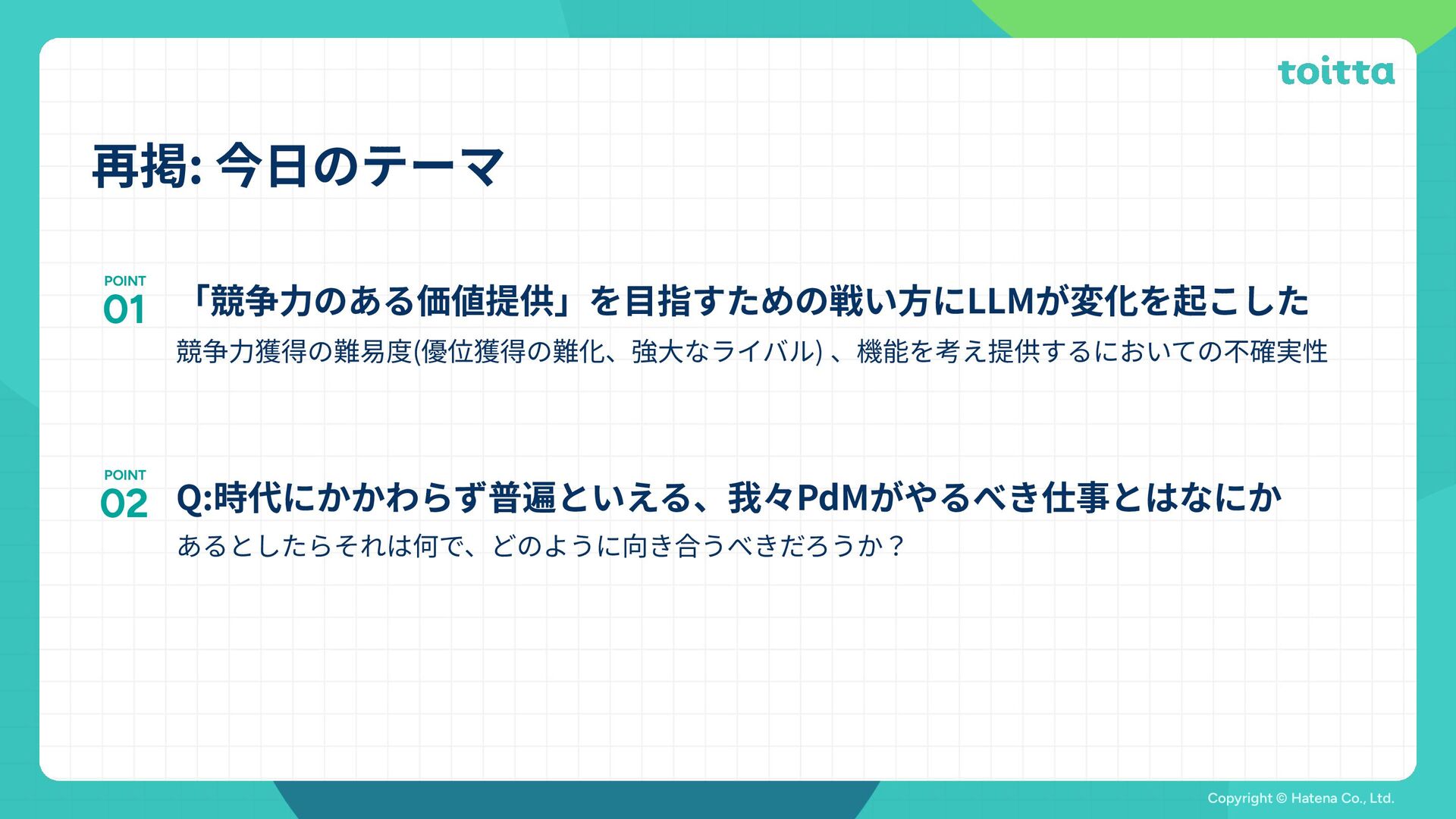 今⽇のテーマ 競争⼒獲得の難易度(優位獲得の難化、強⼤なライバル) 、機能を考え提供するにおいての不確実性 「競争⼒のある価値提供」を⽬指すための戦い⽅にLLMが変化を起こした Q:時代にかかわらず普遍といえる、我々PdMがやるべき仕事とはなにか あるとしたらそれは何で、どのように向き合うべきだろうか?