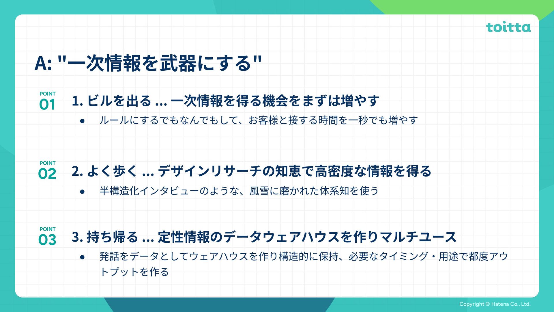 Ltd. • ルールにするでもなんでもして、お客様と接する時間を⼀秒でも増やす A: "⼀次情報を武器にする" 3. 持ち帰る ... 定性情報のデータウェアハウスを作りマルチユース 1. ビルを出る ... ⼀次情報を得る機会をまずは増やす 2. よく歩く ... デザインリサーチの知恵で⾼密度な情報を得る • 半構造化インタビューのような、⾵雪に磨かれた体系知を使う • 発話をデータとしてウェアハウスを作り構造的に保持、必要なタイミング‧⽤途で都度アウ トプットを作る