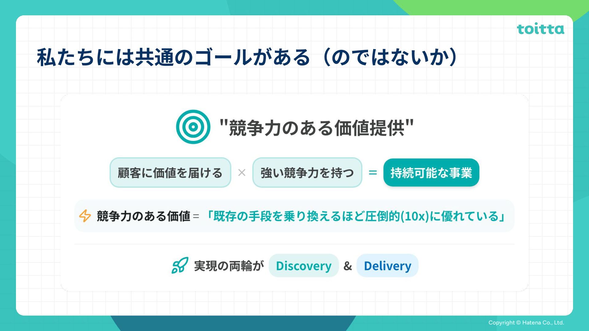 Copyright © Hatena Co., Ltd. 競争⼒ある価値をし続けるために、時代にかかわらず普遍といえる、 我々PdMがやるべき仕事とはなにか 変わらないこと = 仕事のゴール