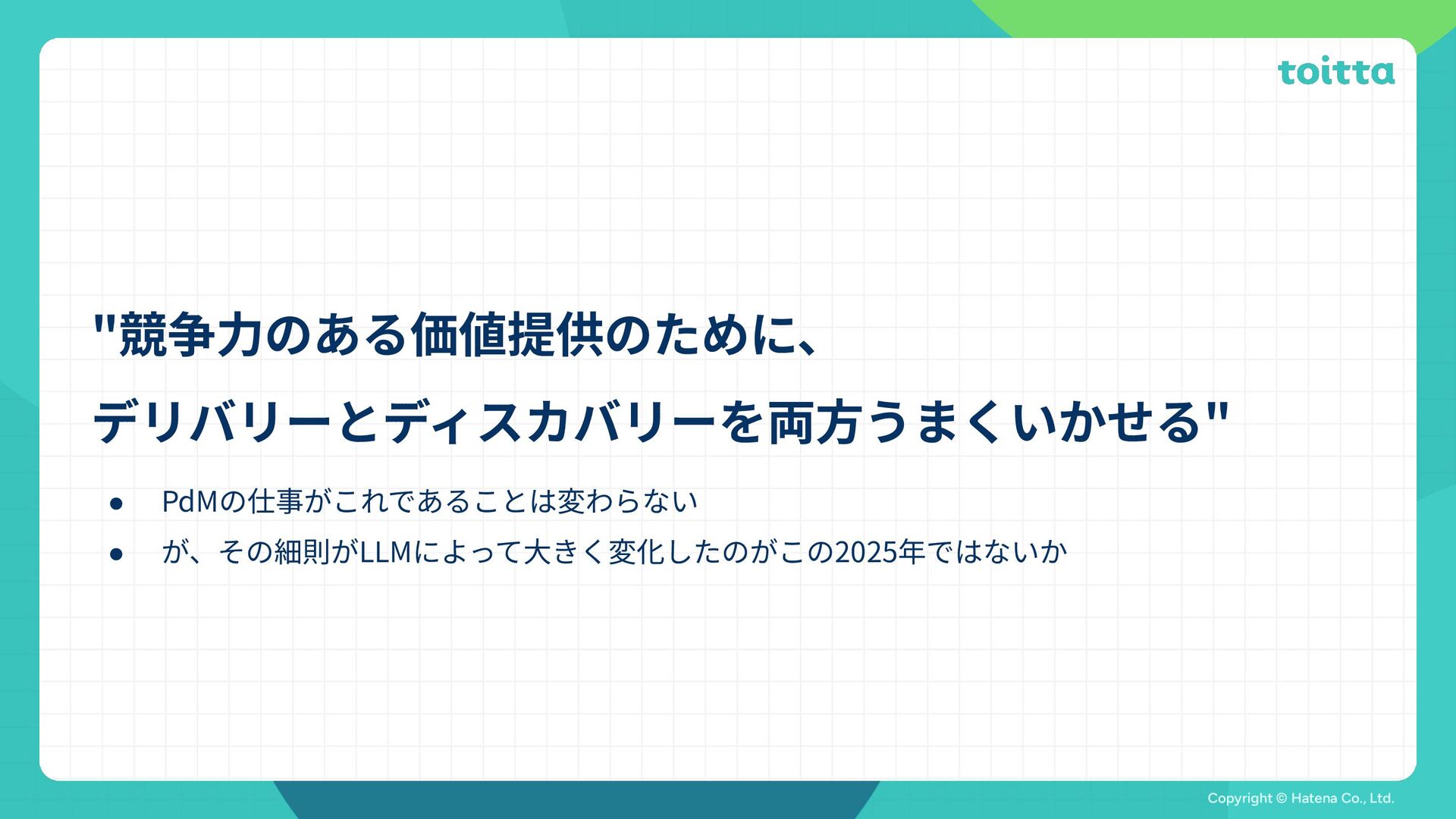 Copyright © Hatena Co., Ltd. • PdMの仕事がこれであることは変わらない • が、その細則がLLMによって⼤きく変化したのがこの2025年ではないか "競争⼒のある価値提供のために、