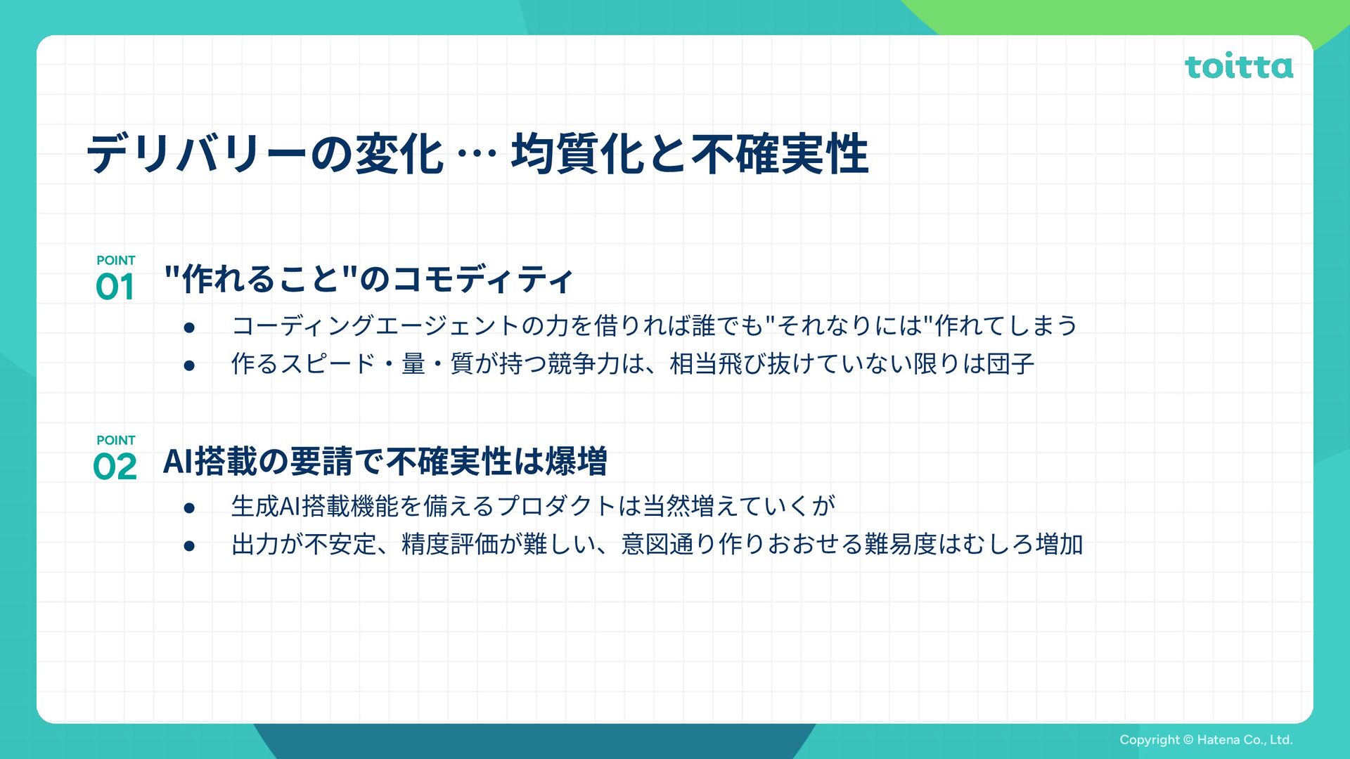 … 均質化と不確実性 • コーディングエージェントの⼒を借りれば誰でも"それなりには"作れてしまう • 作るスピード‧量‧質が持つ競争⼒は、相当⾶び抜けていない限りは団⼦ "作れること"のコモディティ AI搭載の要請で不確実性は爆増 • ⽣成AI搭載機能を備えるプロダクトは当然増えていくが • 出⼒が不安定、精度評価が難しい、意図通り作りおおせる難易度はむしろ増加