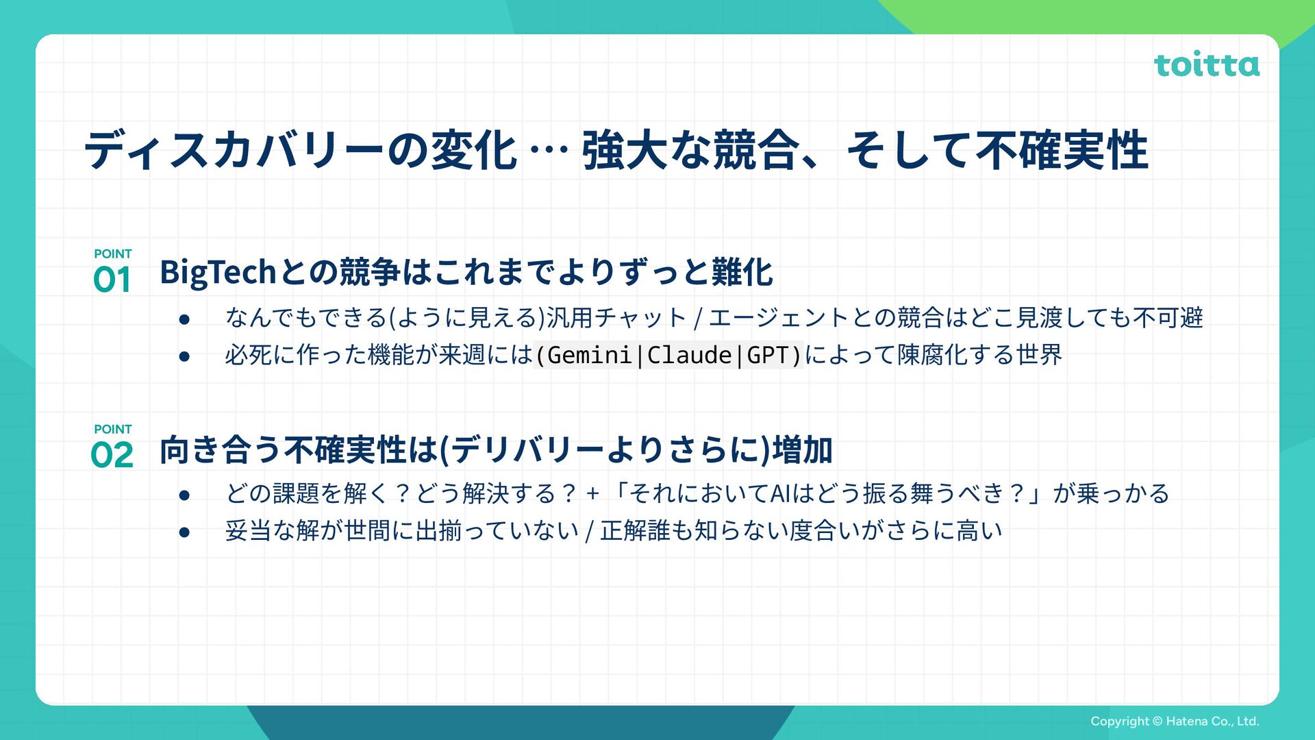 … 強⼤な競合、そして不確実性 • なんでもできる(ように⾒える)汎⽤チャット / エージェントとの競合はどこ⾒渡しても不可避 • 必死に作った機能が来週には(Gemini|Claude|GPT)によって陳腐化する世界 BigTechとの競争はこれまでよりずっと難化 向き合う不確実性は(デリバリーよりさらに)増加 • どの課題を解く?どう解決する? + 「それにおいてAIはどう振る舞うべき?」が乗っかる • 妥当な解が世間に出揃っていない / 正解誰も知らない度合いがさらに⾼い