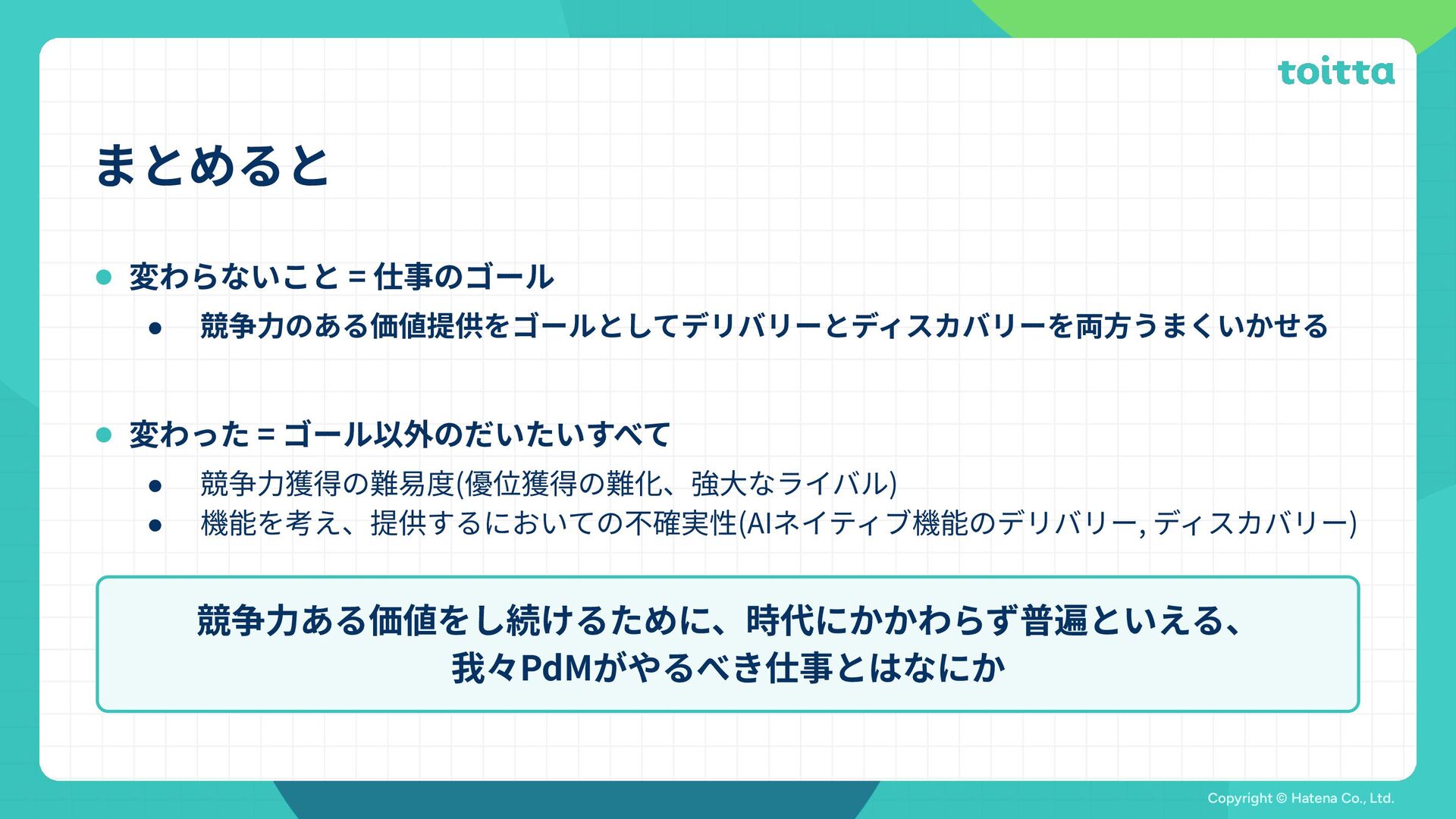 まとめると • 競争⼒のある価値提供をゴールとしてデリバリーとディスカバリーを両⽅うまくいかせる 変わった = ゴール以外のだいたいすべて • 競争⼒獲得の難易度(優位獲得の難化、強⼤なライバル) • 機能を考え、提供するにおいての不確実性(AIネイティブ機能のデリバリー, ディスカバリー)