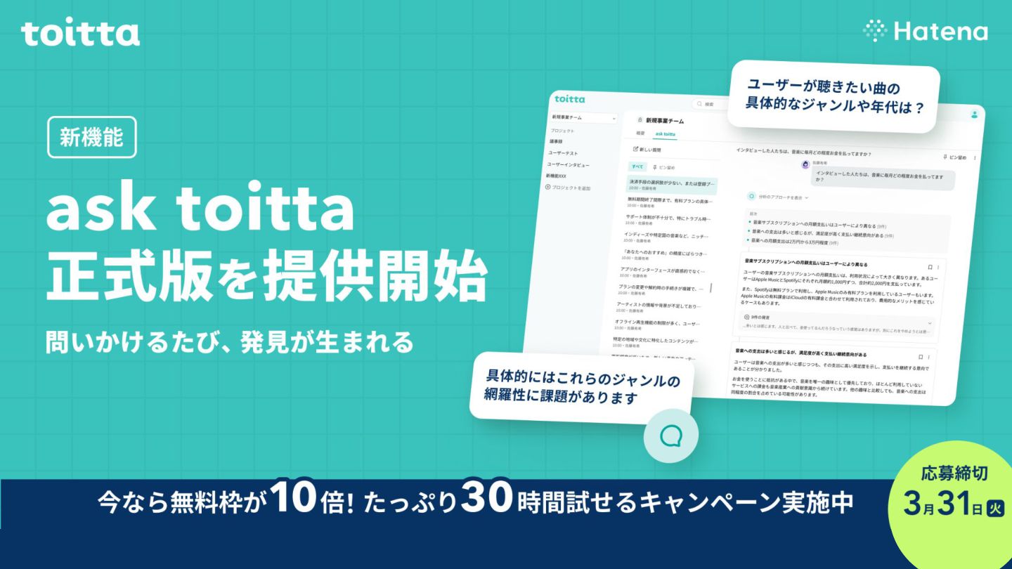 "ベータ版から大幅進化。精度と体験を刷新したask toitta正式版をリリースしました | 無料トライアル10倍キャンペーンも実施中"
