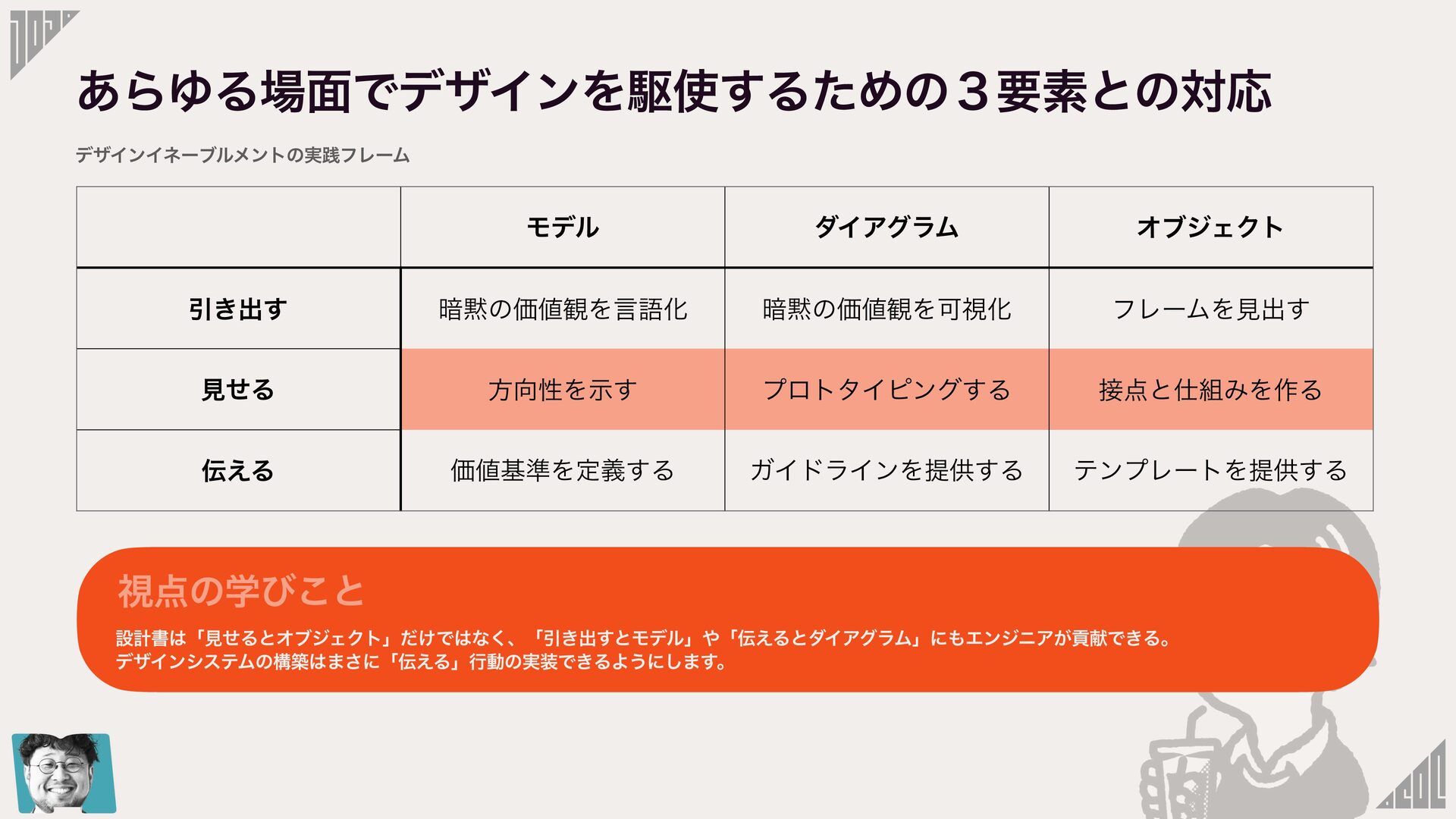 ͋ΒΏΔ໘ͰσβΠϯΛۦ͢ΔͨΊͷ̏ཁૉͱͷରԠ σβΠϯΠωʔϒϧϝϯτͷ࣮ફϑϨʔϜ Ϟσϧ μΠΞάϥϜ ΦϒδΣΫτ Ҿ͖ग़͢ ҉ͷՁ؍ΛݴޠԽ ҉ͷՁ؍ΛՄࢹԽ ϑϨʔϜΛݟग़͢ ݟͤΔ
