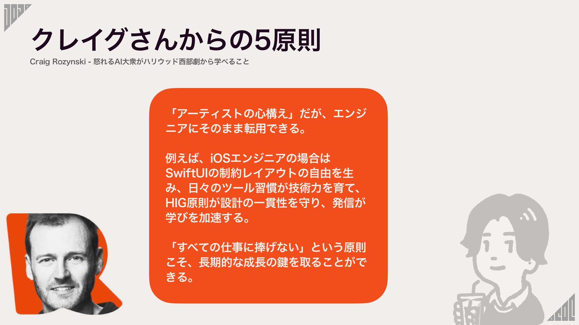 ͷ࣌ͦ͜ʮϞσϧʯͱʮղऍྗʯ͕Ձ ྫ͑SwiftUIͰίϯϙʔωϯτΛ࡞Δͱ͖ɺʮ͜ͷମݧԿΛकΔͨΊͷͷ͔ʯͱ͍͏͍Λ࣋ͯΔ͔ͰՌͷ࣭͕มΘΔ ʮ$SFBUJWFGSFFEPNOFFETDPOTUSBJOUTʯྫ͑ɺ4XJGU6*ͷએݴతϨΠΞτɺOPUFͷΤσΟλઃܭʹ௨͡Δීวతݪଇ 4JMJDPO7BMMFZ4QFFE͢+BQBOFTF4PVM-FBO.POP[VLVSJɻ͞ͱ࣭ͷΦʔέετϨʔγϣϯͰ͖Δ σβΠϯɾΠωʔϒϧϝϯτͱ 3ཁૉɻAI͕ߴԽ͢ΔͷμΠΞάϥϜͱΦϒδΣΫτɻϞσϧਓؒͷྖҬ ൃ৴ͱश׳͕ΛՃ͢Δ ຖ2࣌ؒͷࣗ࣌ؒ× ඪͷϒϩʔυΩϟετɻςοΫτʔΫɺϒϩάɺWWDC Watch Party ͰֶͼΛ॥ͤ͞Δ͜ͱ
