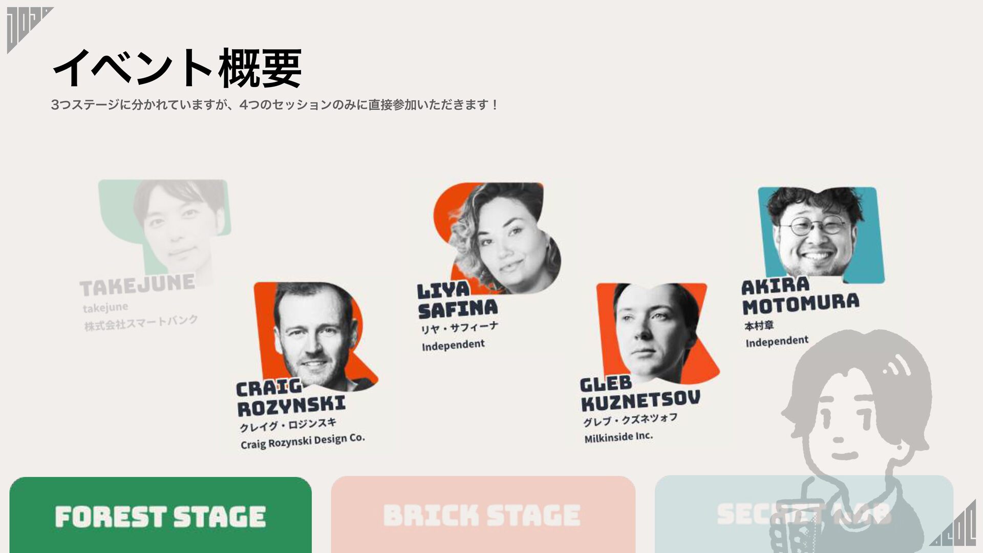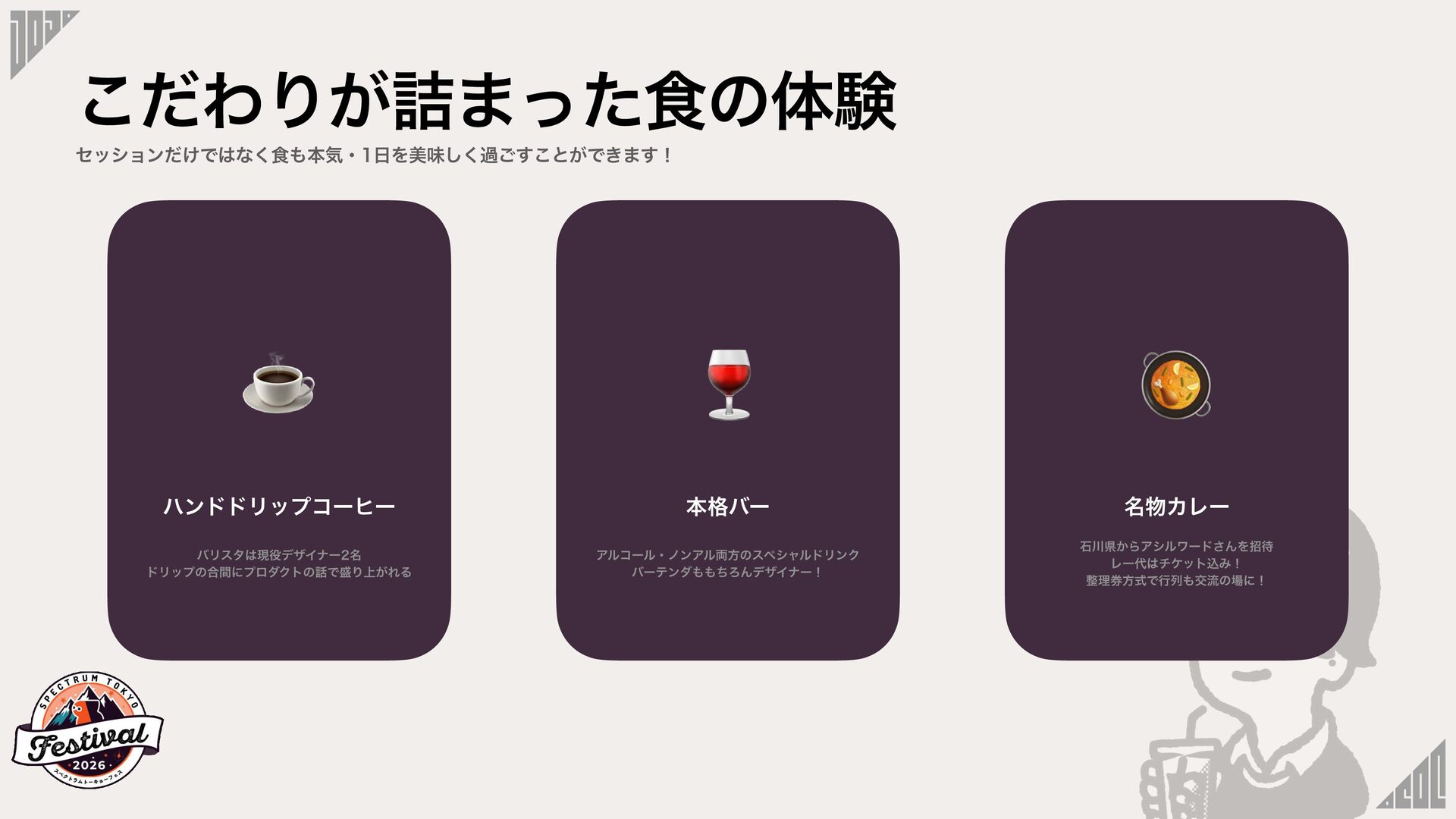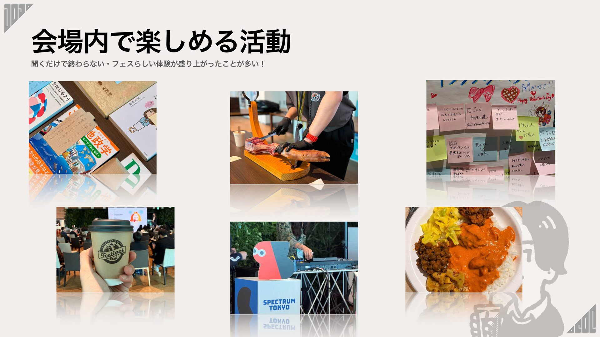 4QFDUSVN5PLZP'FTUJWBMͱ ϑΣεܕσβΠϯΠϕϯτ ରΛॏࢹͨ͠ઃܭ ϑΣεײ͋;ΕΔମݧ εςʔδɾҎ্ηογϣϯ ԻָϑΣεͷΑ͏ʹࣗ༝ʹճ༡ "."ηογϣϯͰొஃऀͱର %+ɾΧϨʔɾίʔώʔɾੜϋϜ ࣅإֆɾϒοΫεϫοϓɾϓϩϯϓτότϧ ʮΧϯϑΝϨϯεʯ͚ͩͰͳ͘ɺʮϑΣεςΟόϧʯͩ
