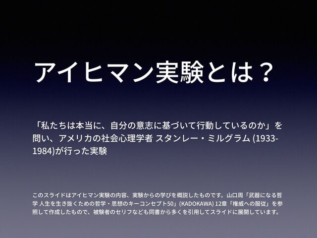 アメリカの社会心理学者 スタンレー・ミルグラム (1933-1984)が行ったアイヒマン実験の内容、実験からの学びを概説したスライドです。「私たちは本当に、自分の意志に基づいて行動しているのか」を問うたもの。