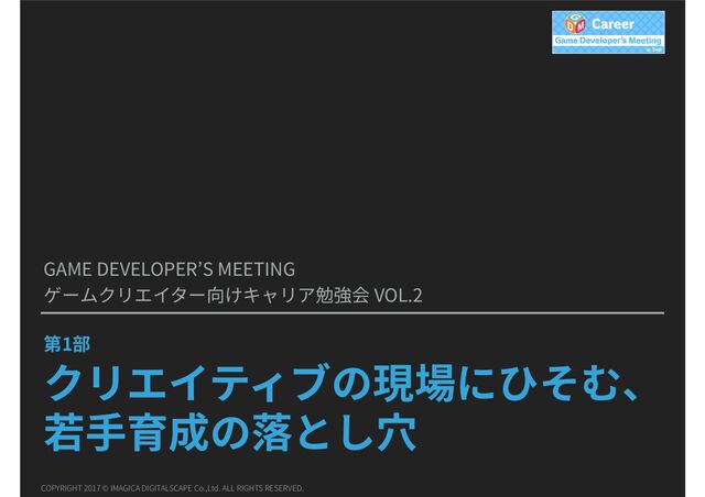 2017年7月25日に開催されたDeNA主催「Game Developer's Meeting」シリーズ ゲームクリエイター向けキャリア勉強会Vol.2の第1部に登壇したときのスライド。詳しくはブログにて。 スライド共有:クリエイティブの現場にひそむ、若手育成の落とし穴│心のうち http://hysmrk.cocolog-nifty.com/blog/2017/12/post-a899.html