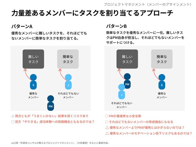 プロジェクトマネジメントにおけるメンバーのアサインメント・アプローチについて。プロジェクトのメンバーに「優秀な人」「それほどでもない人」がいるとき、アサインの仕方として「やりがちなミス」と断ずるパターンAが妥当なこともあろうかなと思ったので、なんでそう思うのか考えてみた。 詳しくはブログにて。 力量差あるメンバーにタスクを割り当てるアプローチ┃心のうち https://hysmrk.cocolog-nifty.com/blog/2025/01/post-e19548.html