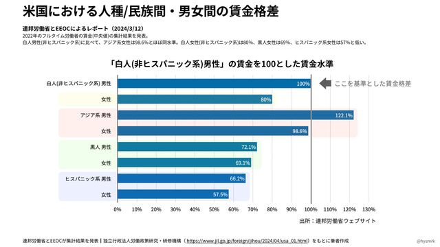 米国における男女賃金格差の現状というレポートを見ていたら、男女格差以上に「アジア勢の強さ」にびっくり。「白人男性(非ヒスパニック系)に比べて、アジア系女性は98.6%とほぼ同水準」とあり、じゃあアジア系男性はというと、なんと122.1%。強し。後から台頭してきたからなのかなんなのか。インドと中国が強い?思わずグラフ化してしまった...