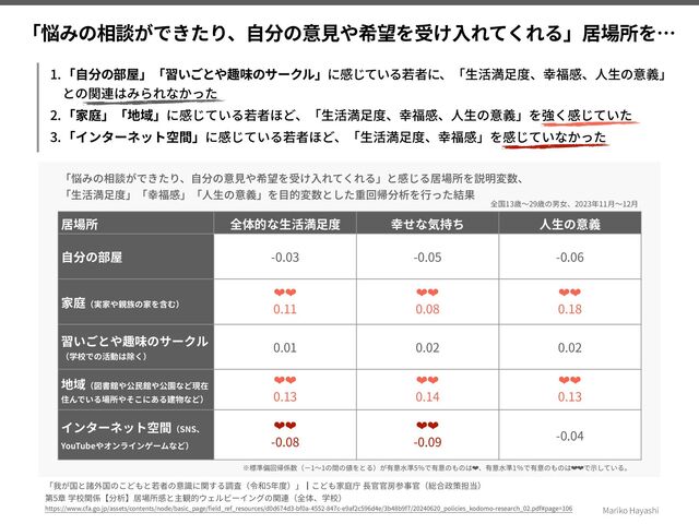一方、「インターネット空間」では相関関係の正・負が反転していた。つまり、SNS、YouTubeやオンラインゲームなどの「インターネット空間」で「悩みの相談ができたり、自分の意見や希望を受け入れてくれる」と感じている若者ほど、生活満足度と幸福感を”感じていなかった”。