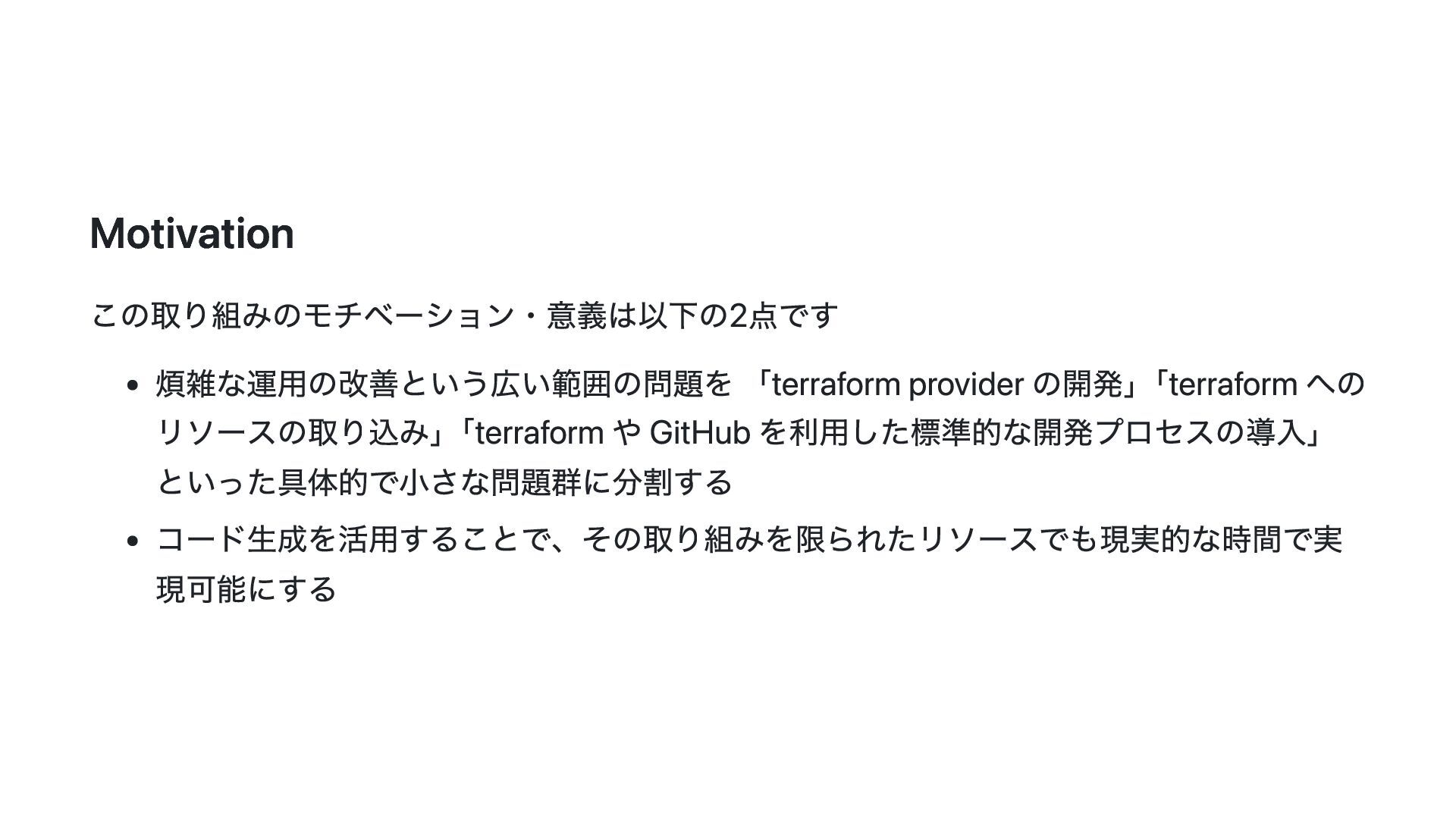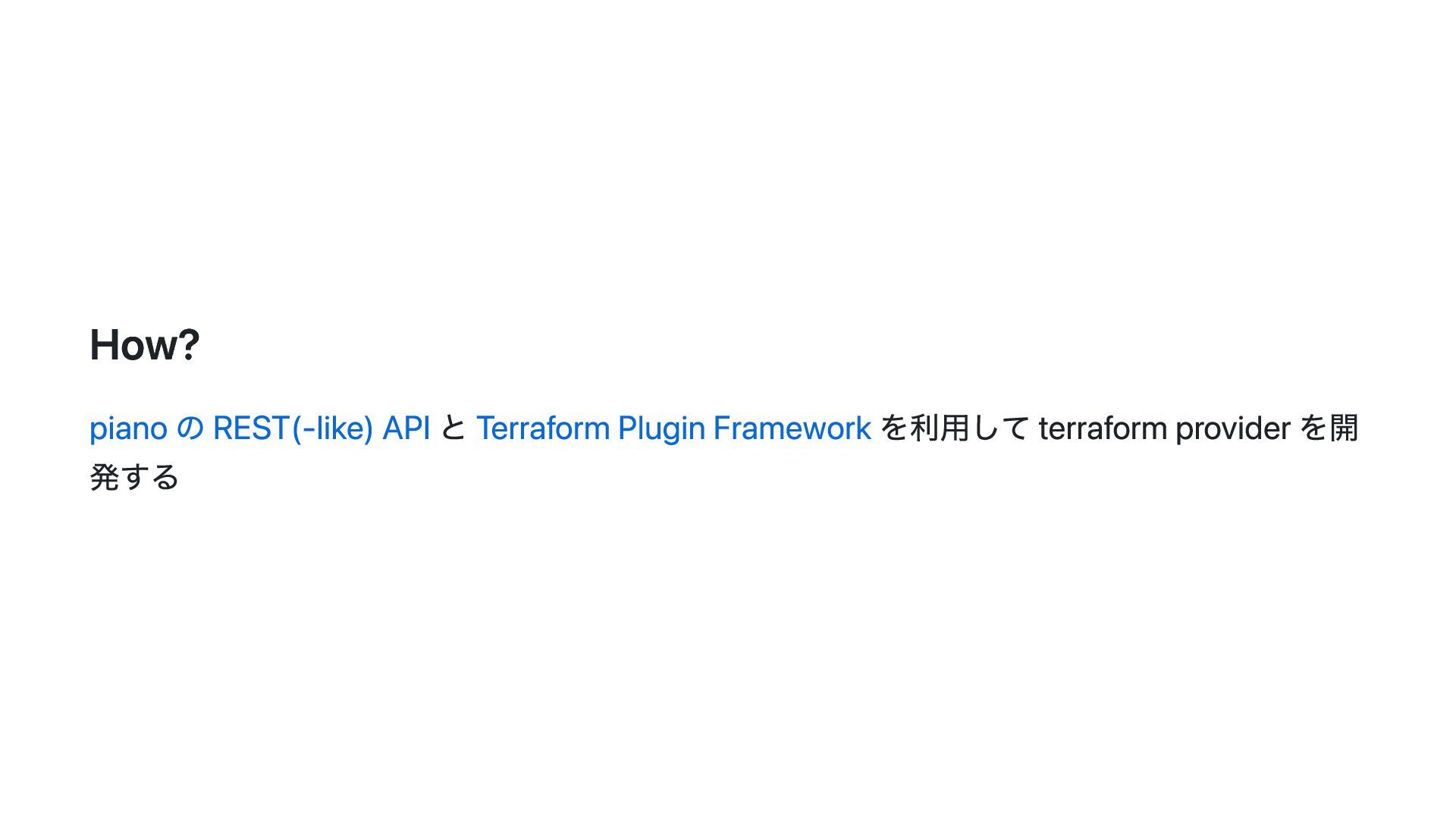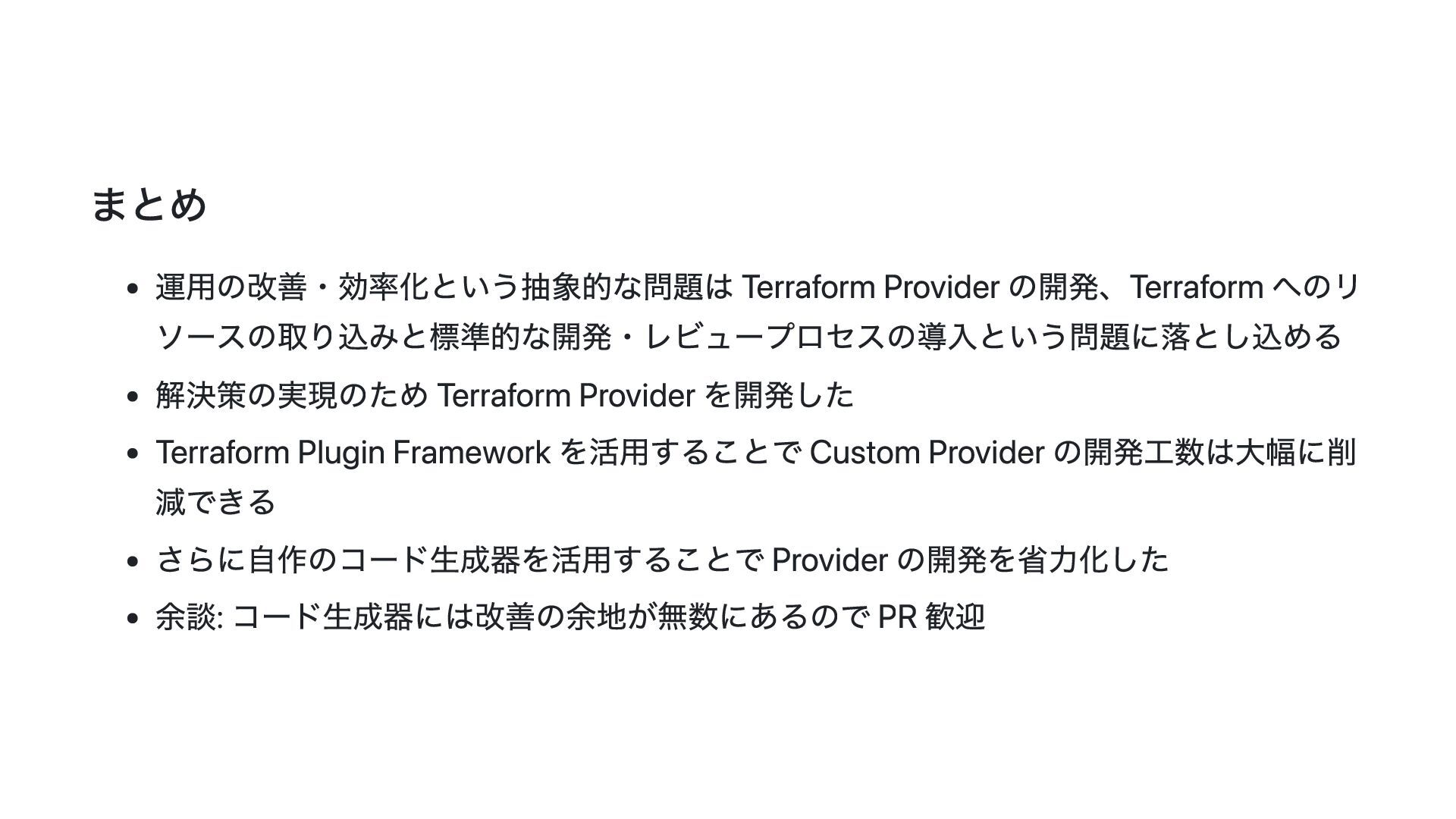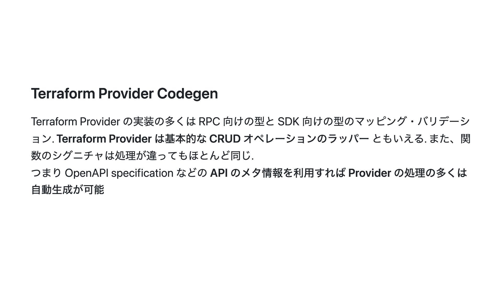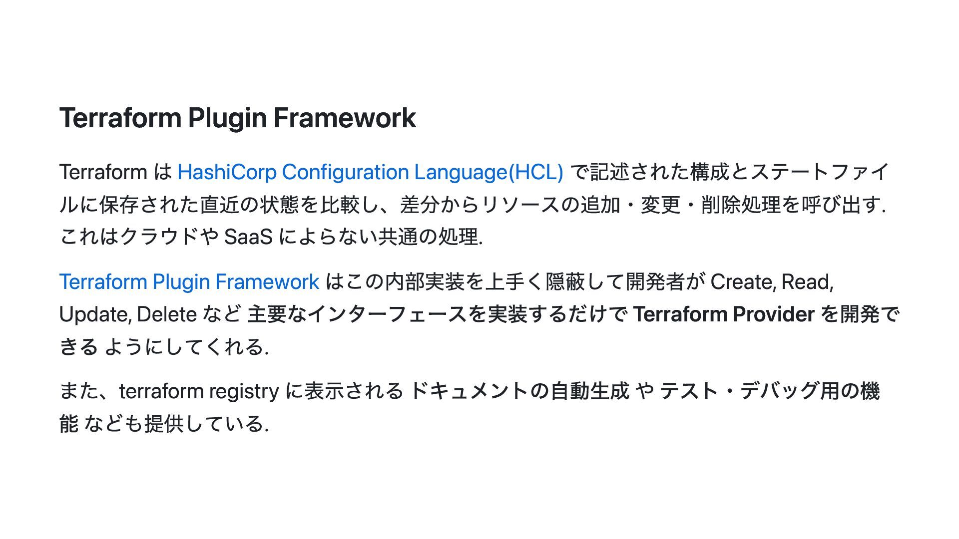 このスライドでは、その動機・背景と Terraform Plugin Framework を利用した provider 開発の概要について説明します。