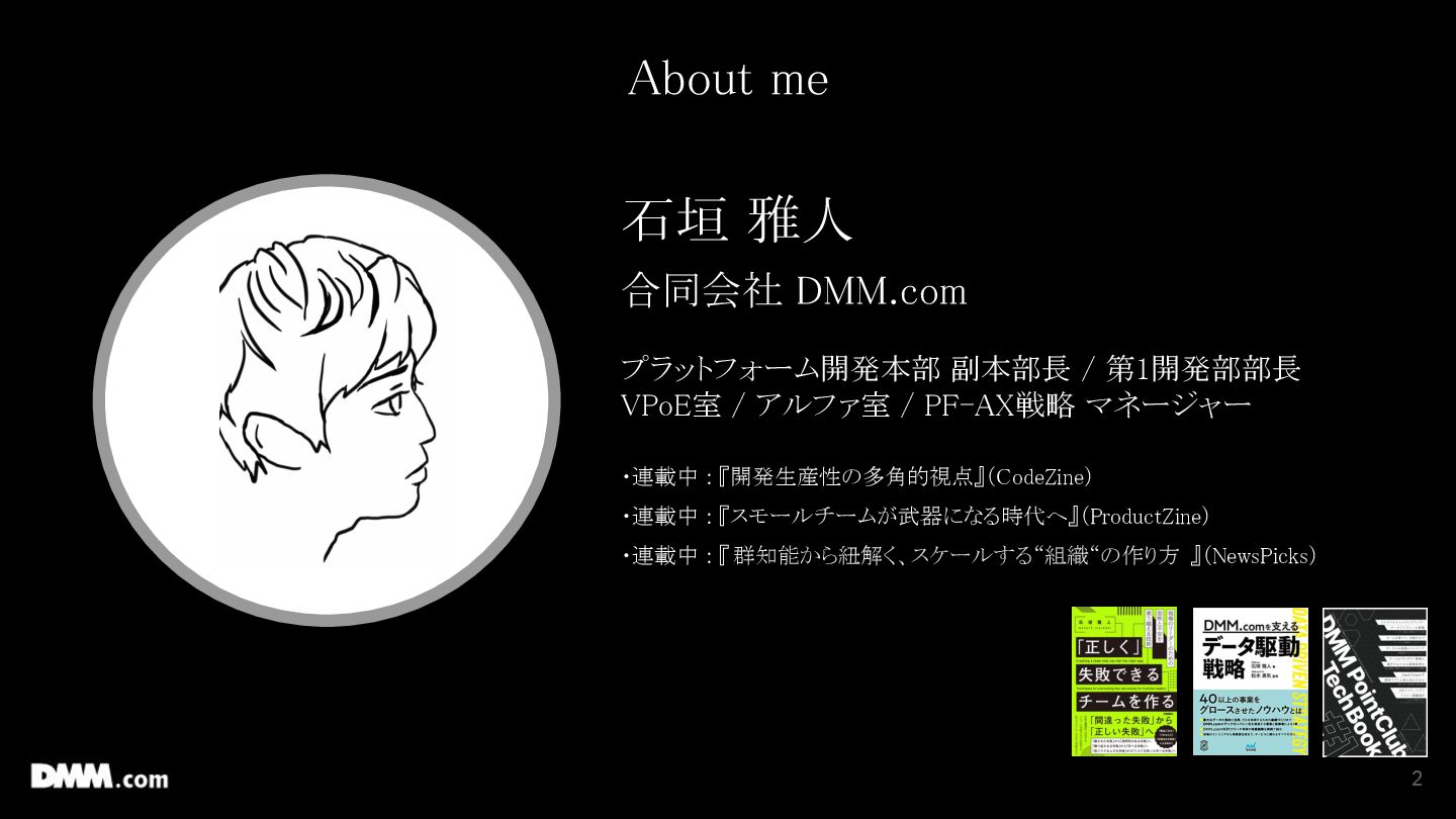2 About me 石垣 雅人 合同会社 DMM.com プラットフォーム開発本部 副本部長