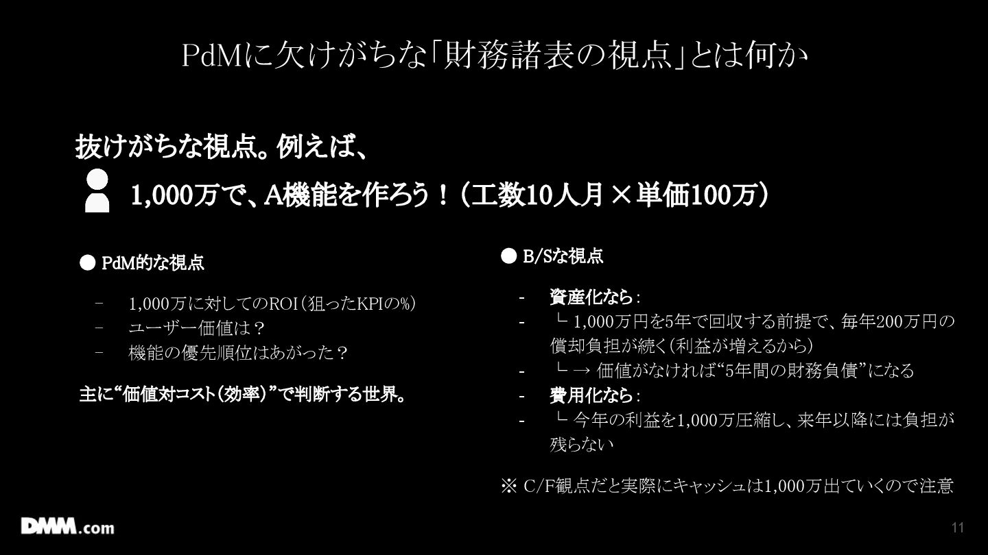 - ユーザー価値は? - 機能の優先順位はあがった? 主に“価値対コスト(効率)”で判断する世界。 • B/Sな視点 - 資産化なら: - └ 1,000万円を5年で回収する前提で、毎年200万円の 償却負担が続く(利益が増えるから) - └ → 価値がなければ“5年間の財務負債”になる - 費用化なら: - └ 今年の利益を1,000万圧縮し、来年以降には負担が 残らない ※ C/F観点だと実際にキャッシュは1,000万出ていくので注意 PdMに欠けがちな「財務諸表の視点」とは何か