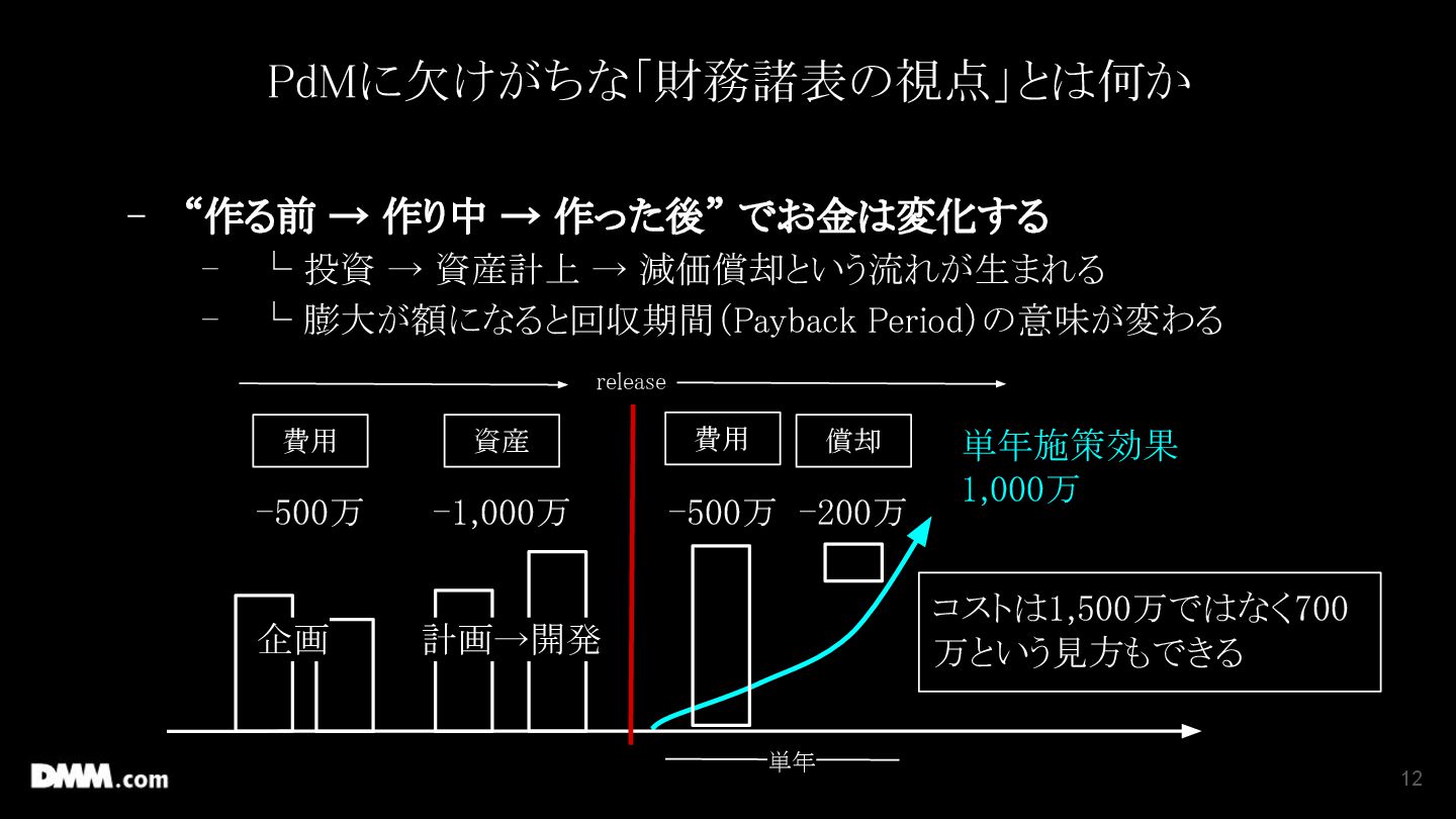 - └ 投資 → 資産計上 → 減価償却という流れが生まれる - └ 膨大が額になると回収期間(Payback Period)の意味が変わる 計画→開発 -500万 -1,000万 企画 -500万 単年施策効果 1,000万 費用 償却 費用 資産 release コストは1,500万ではなく700 万という見方もできる 単年 PdMに欠けがちな「財務諸表の視点」とは何か