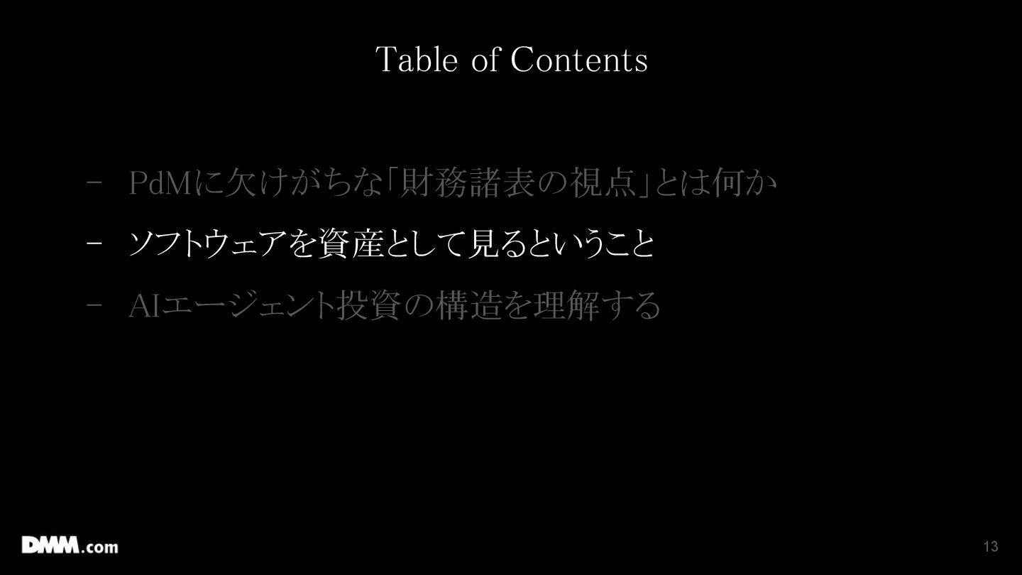 13 Table of Contents - PdMに欠けがちな「財務諸表の視点」とは何か - ソフトウェアを資産として見るということ - AIエージェント投資の構造を理解する