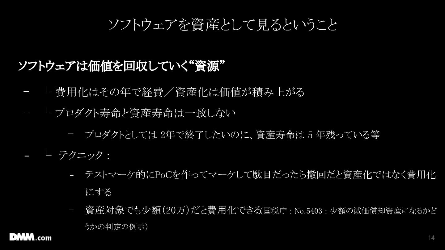 - プロダクトとしては 2年で終了したいのに、資産寿命は 5 年残っている等 - └ テクニック : - テストマーケ的にPoCを作ってマーケして駄目だったら撤回だと資産化ではなく費用化 にする - 資産対象でも少額(20万)だと費用化できる (国税庁 : No.5403 : 少額の減価償却資産になるかど うかの判定の例示)