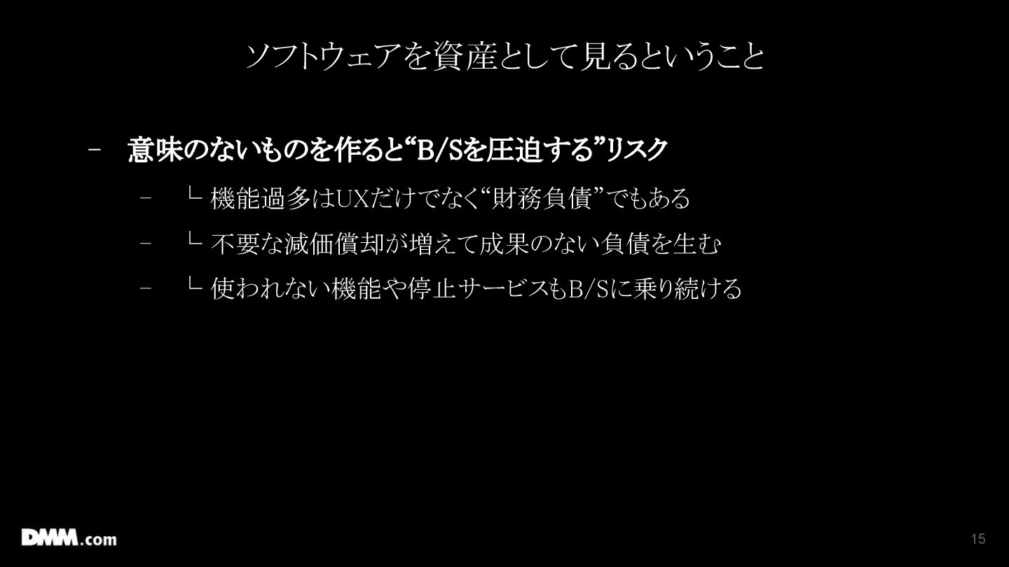 15 ソフトウェアを資産として見るということ - 意味のないものを作ると“B/Sを圧迫する”リスク - └ 機能過多はUXだけでなく“財務負債”でもある - └