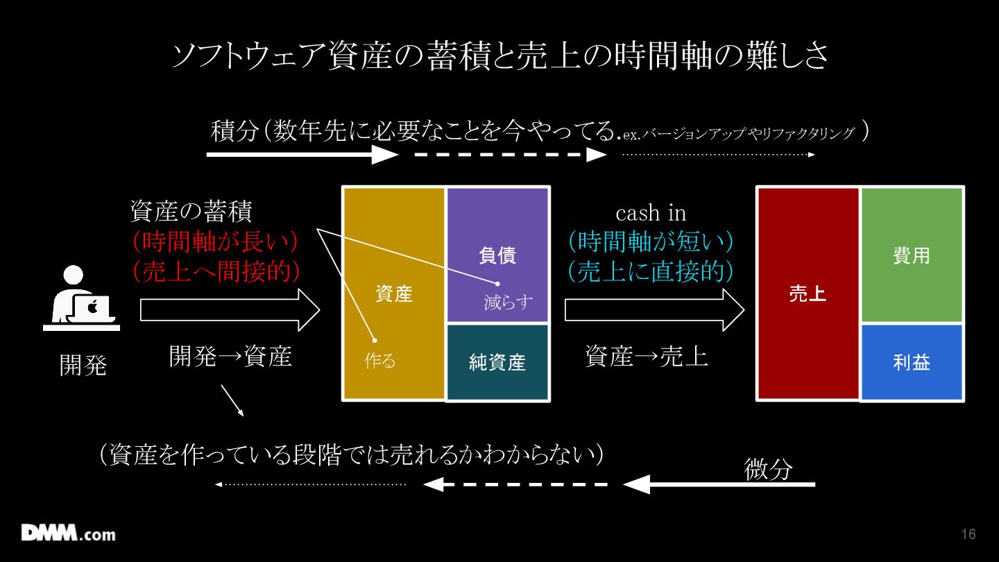 (時間軸が長い) (売上へ間接的) cash in (時間軸が短い) (売上に直接的) 積分(数年先に必要なことを今やってる.ex.バージョンアップやリファクタリング ) 微分 開発 資産→売上 開発→資産 作る 減らす (資産を作っている段階では売れるかわからない)