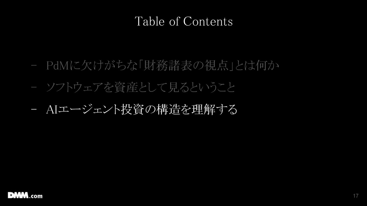 17 Table of Contents - PdMに欠けがちな「財務諸表の視点」とは何か - ソフトウェアを資産として見るということ - AIエージェント投資の構造を理解する