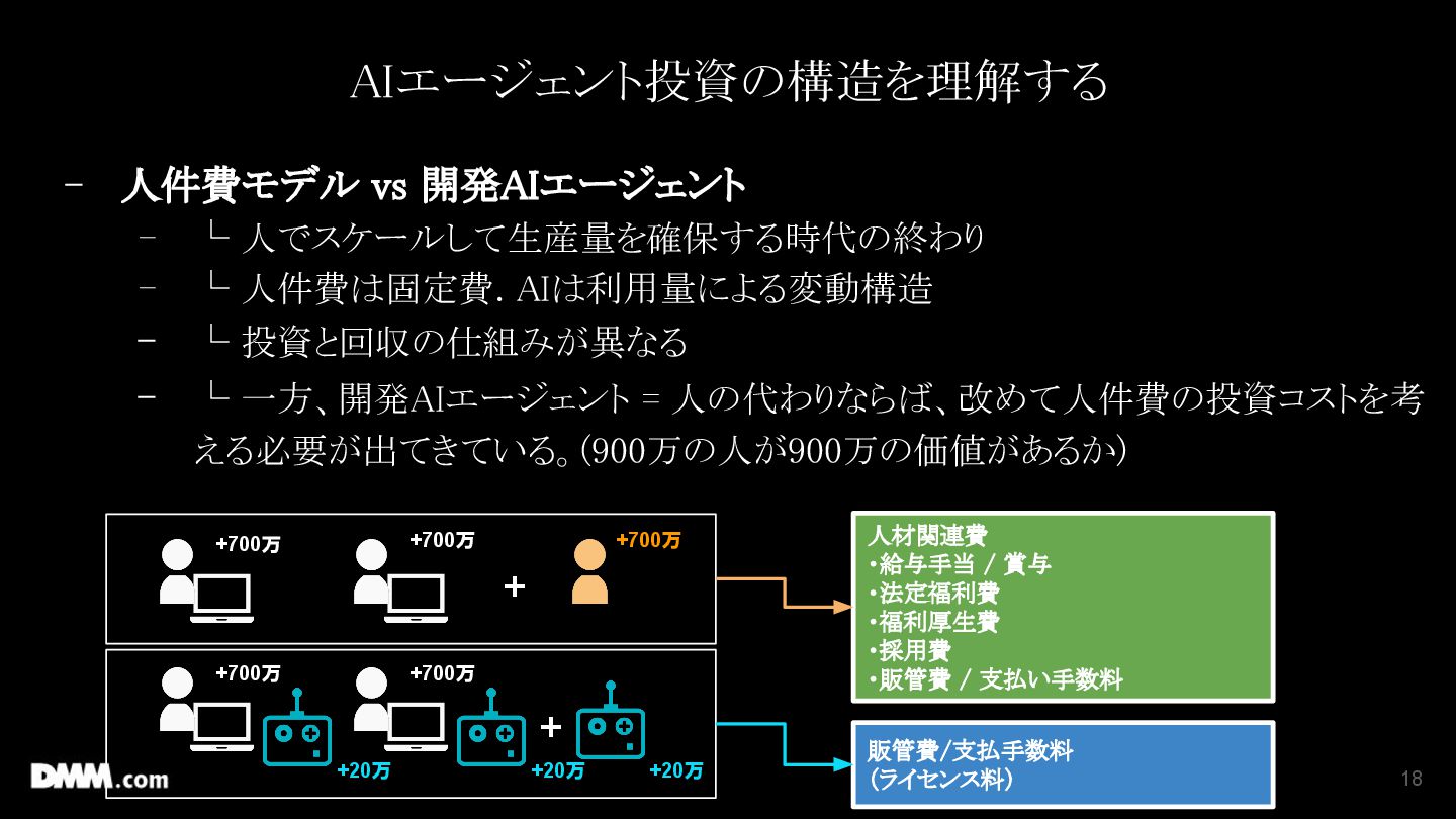 18 AIエージェント投資の構造を理解する - 人件費モデル vs 開発AIエージェント - └ 人でスケールして生産量を確保する時代の終わり