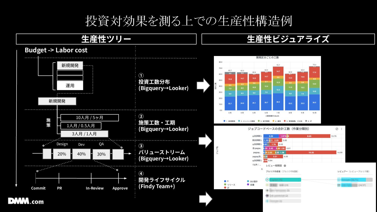 ‧‧‧ 新規開発 10⼈⽉ / 5ヶ⽉ 1⼈⽉ / 0.5⼈⽉ 3⼈⽉ / 1⼈⽉ 20% 40% 30% PR In-Review Approve Commit ① 投資⼯数分布 (Bigquery→Looker) ② 施策⼯数‧⼯期 (Bigquery→Looker) ③ バリューストリーム (Bigquery→Looker) ④ 開発ライフサイクル (Findy Team+) Design UI Dev 施 策 ⽣産性ツリー ⽣産性ビジュアライズ QA