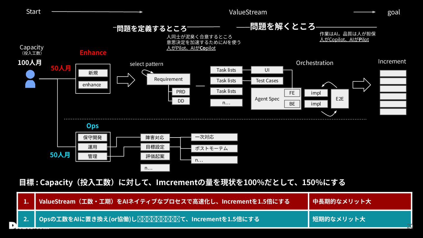Ops 障害対応 ⽬標設定 ⼀次対応 ポストモーテム n… 評価起案 n… 50⼈⽉ 50⼈⽉ ValueStream Requirement Task lists Task lists Task lists UI Test Cases select pattern BE FE PRD DD impl impl n… E2E Start Orchestration goal Increment ⽬標 : Capacity(投⼊⼯数)に対して、Imcrementの量を現状を100%だとして、150%にする 1. ValueStream(⼯数‧⼯期)をAIネイティブなプロセスで⾼速化し、Incrementを1.5倍にする 中⻑期的なメリット⼤ 2. Opsの⼯数をAIに置き換え(or協働)し余剰⼯数を25⼈⽉分新規に回して、Incrementを1.5倍にする 短期的なメリット⼤ Capacity (投⼊⼯数) ⼈同⼠が泥臭く合意するところ 意思決定を加速するためにAIを使う ⼈がPilot、AIがCopilot 作業はAI。品質は⼈が担保 ⼈がCopilot、AIがPilot 問題を定義するところ 問題を解くところ 20