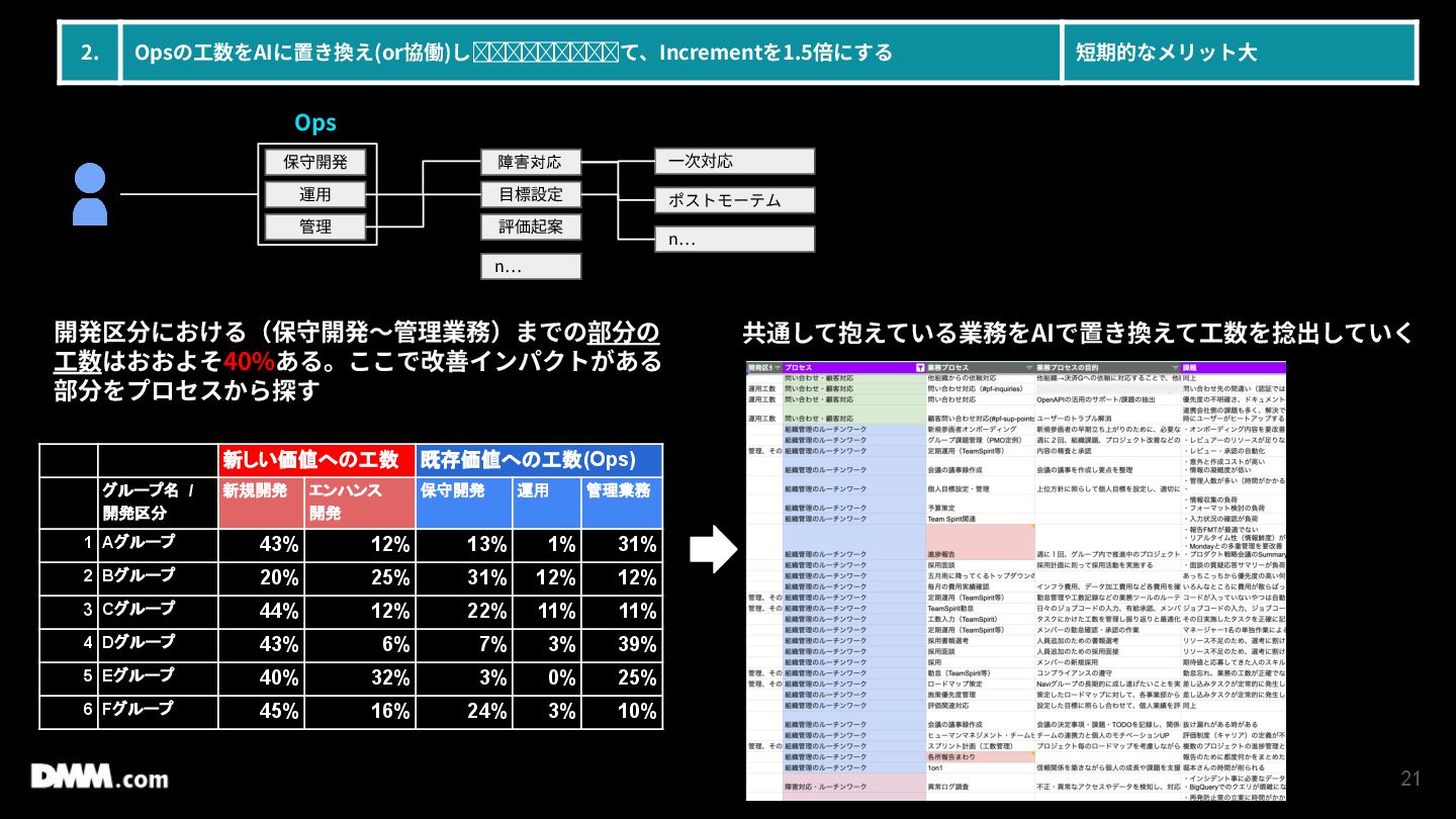 ⼀次対応 ポストモーテム n… 評価起案 n… 共通して抱えている業務をAIで置き換えて⼯数を捻出していく 開発区分における(保守開発〜管理業務)までの部分の ⼯数はおおよそ40%ある。ここで改善インパクトがある 部分をプロセスから探す 新しい価値への工数 既存価値への工数(Ops) グループ名 / 開発区分 新規開発 エンハンス 開発 保守開発 運用 管理業務 1 Aグループ 43% 12% 13% 1% 31% 2 Bグループ 20% 25% 31% 12% 12% 3 Cグループ 44% 12% 22% 11% 11% 4 Dグループ 43% 6% 7% 3% 39% 5 Eグループ 40% 32% 3% 0% 25% 6 Fグループ 45% 16% 24% 3% 10%