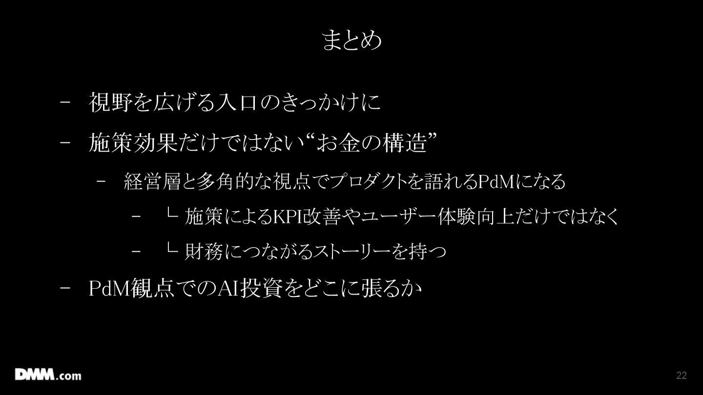 22 まとめ - 視野を広げる入口のきっかけに - 施策効果だけではない“お金の構造” - 経営層と多角的な視点でプロダクトを語れるPdMになる - └