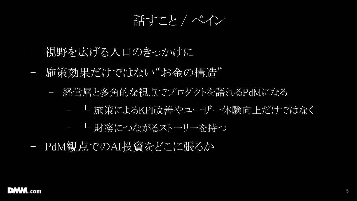 5 話すこと / ペイン - 視野を広げる入口のきっかけに - 施策効果だけではない“お金の構造” - 経営層と多角的な視点でプロダクトを語れるPdMになる