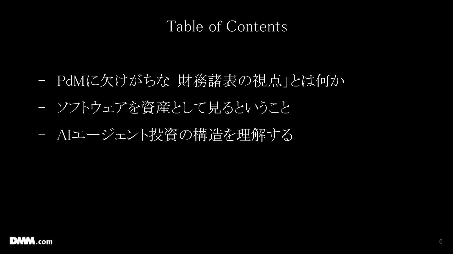 6 Table of Contents - PdMに欠けがちな「財務諸表の視点」とは何か - ソフトウェアを資産として見るということ - AIエージェント投資の構造を理解する