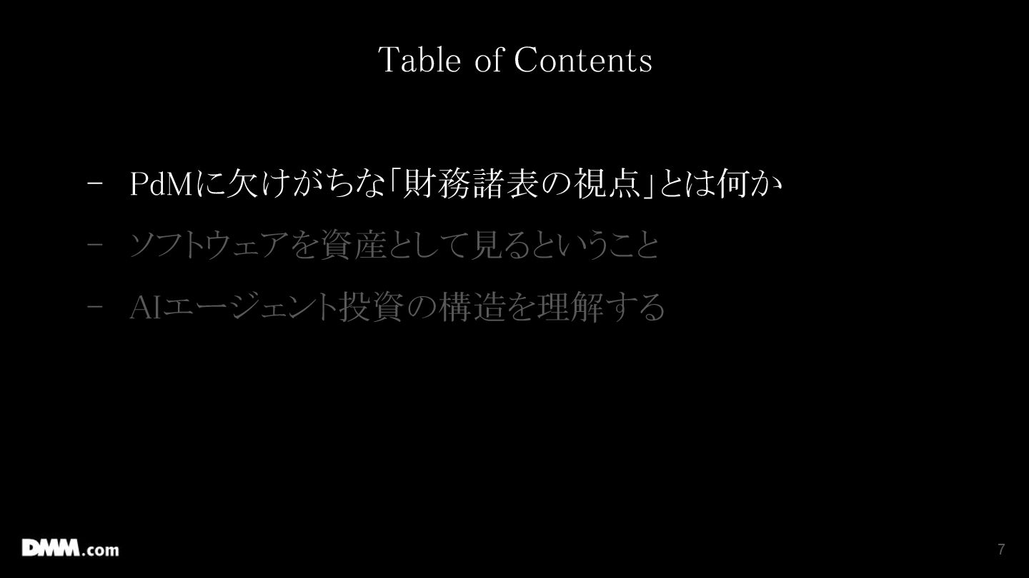 7 Table of Contents - PdMに欠けがちな「財務諸表の視点」とは何か - ソフトウェアを資産として見るということ - AIエージェント投資の構造を理解する