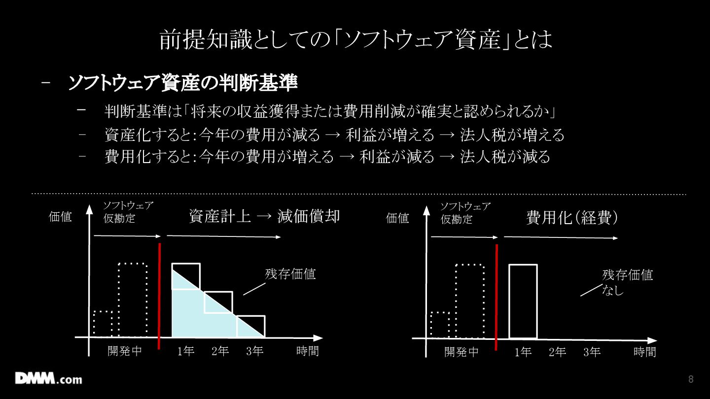 前提知識としての「ソフトウェア資産」とは - ソフトウェア資産の判断基準 - 判断基準は「将来の収益獲得または費用削減が確実と認められるか」 - 資産化すると:今年の費用が減る →